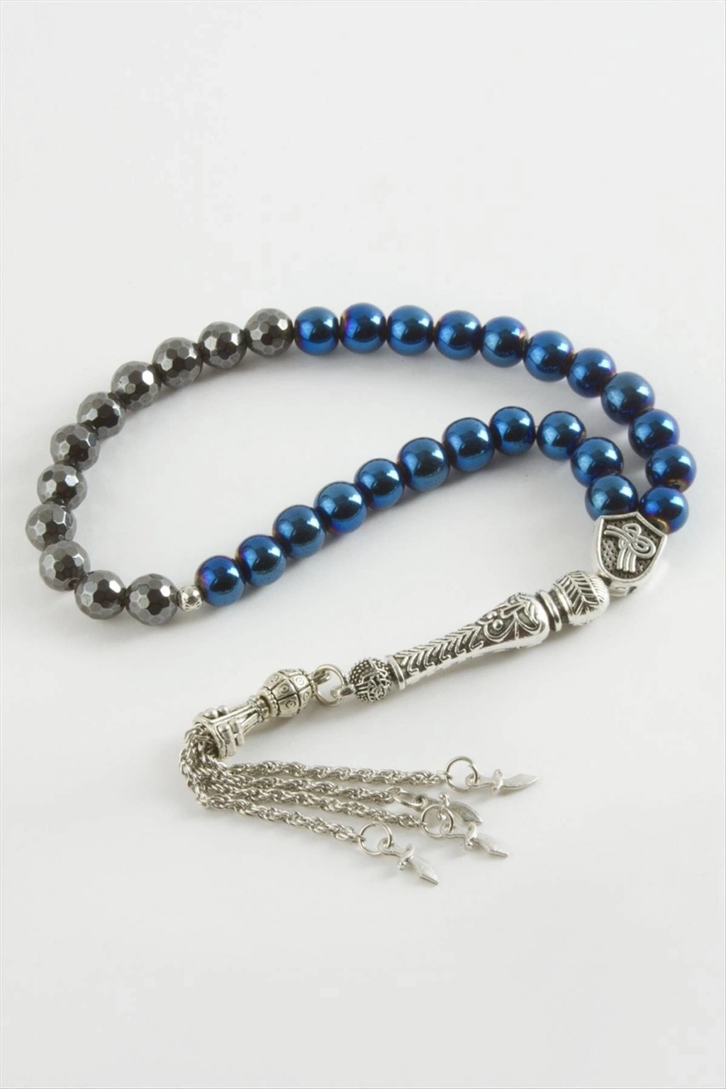 Tesbih; Hematit taşından imal edilmiştir. Ürün yapısı parlakdır. Püskül kararma yapmaz. Taşlar misina üzerine dizilmişdir.Taş boyutu 8 mm'dir.