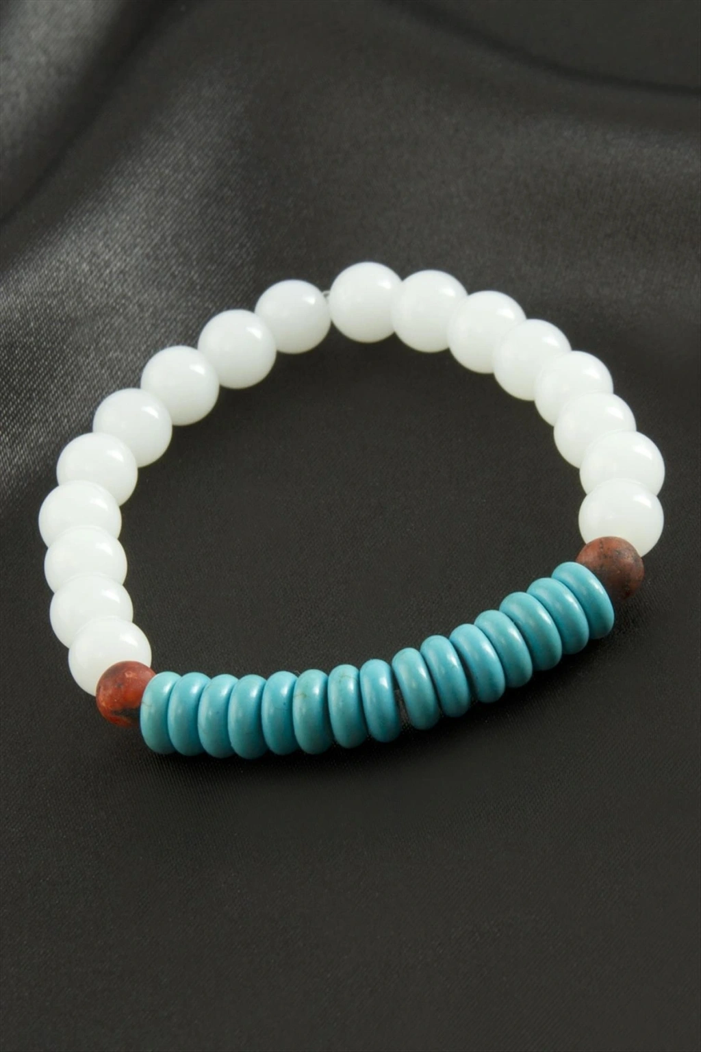 Bileklik: Ürün malzemesi firuze ve ceyt doğaltaşından imal edilmiştir. Misina üzerine dizilmiştir. Misina esneme özelliği bulunmaktadır.