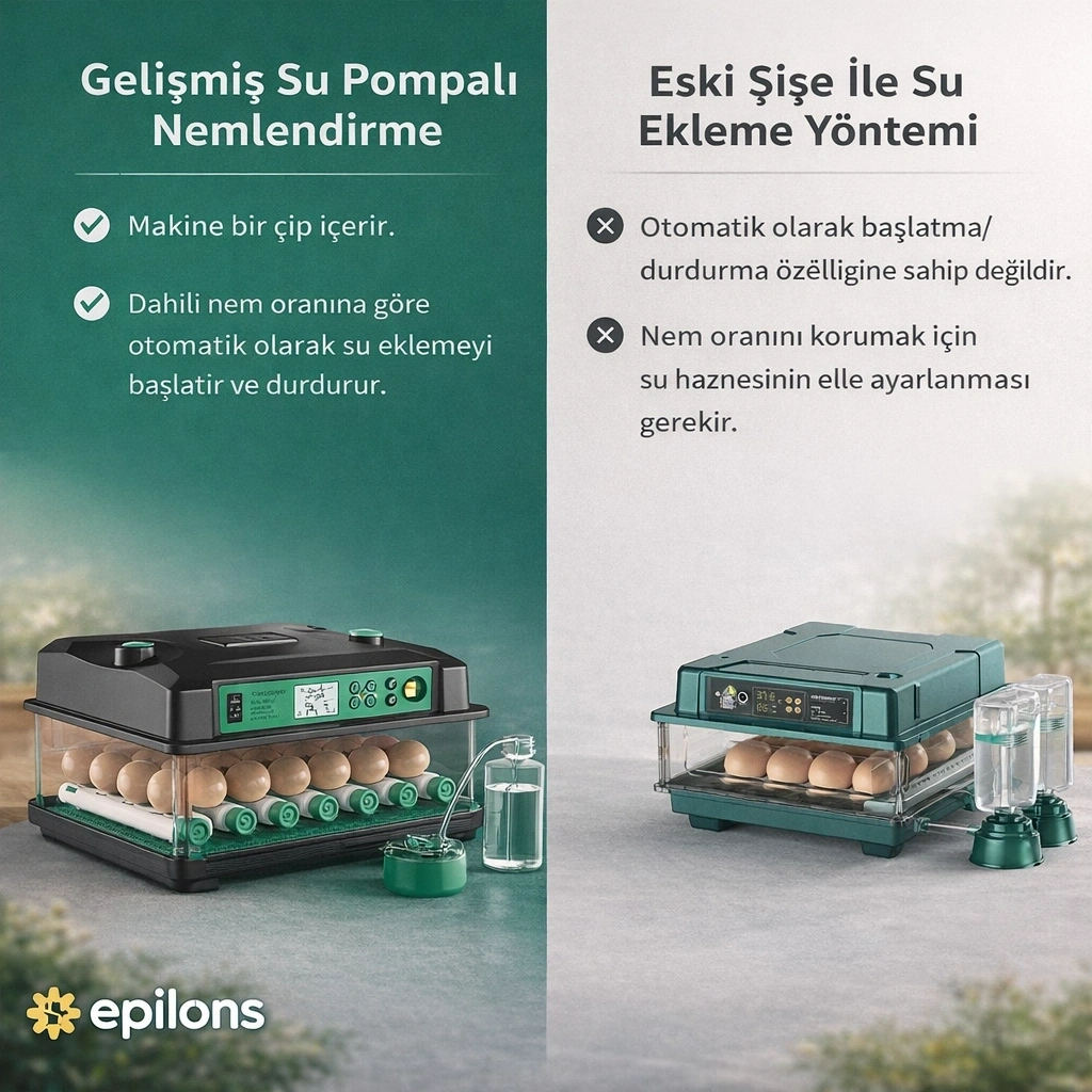 Cihazda yer alan akıllı kontrol paneli ile sıcaklık ve nem değerleri hassas şekilde kontrol edilir. Yeni nesil su hazneli nemlendirme sistemi sayesinde nem seviyesi otomatik olarak dengelenir. Üst kapakta bulunan nem tahliye kapağı, içerideki fazla nemin kontrollü şekilde dışarı atılmasını sağlayarak ideal kuluçka ortamı oluşturur.