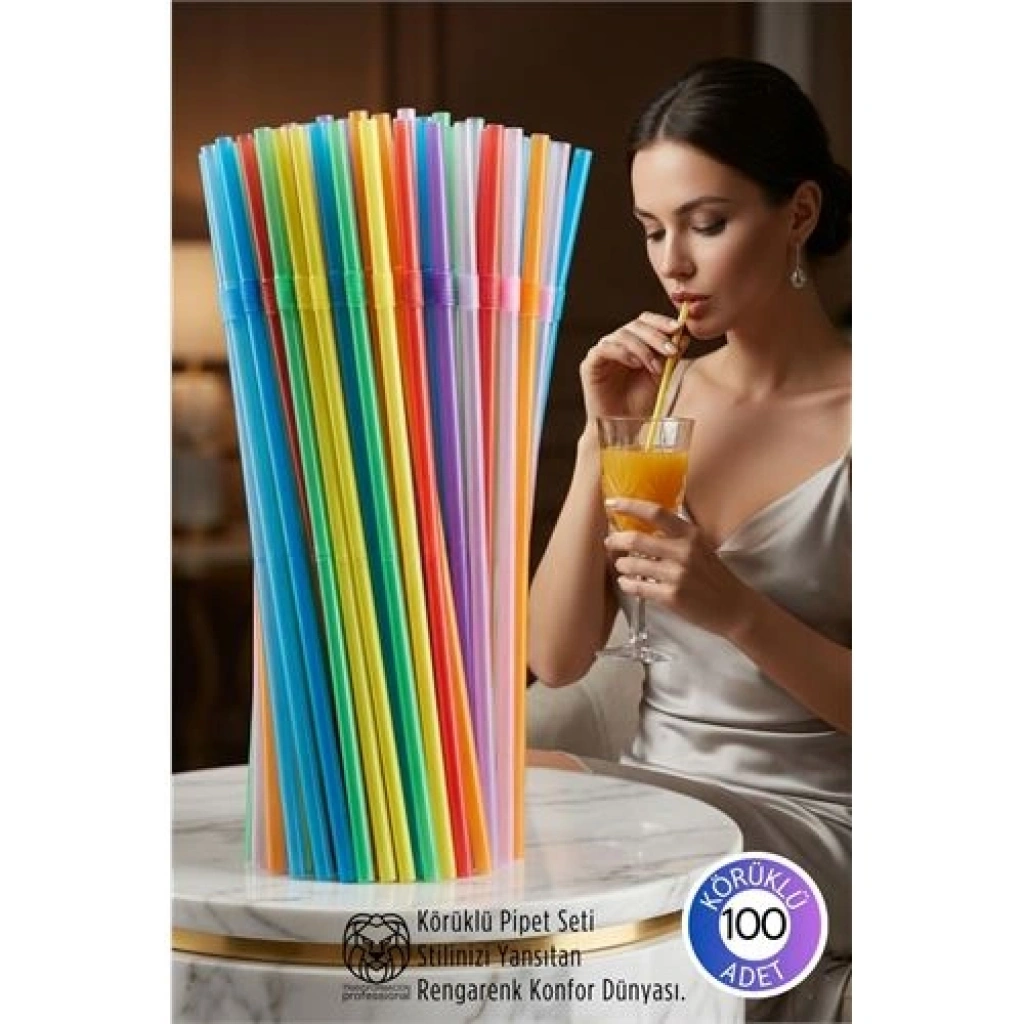 Gökkuşağı Serisi: 100’lü Esnek Körüklü Lüx İçecek Pipeti – 22 cm Premium Sunum Seti