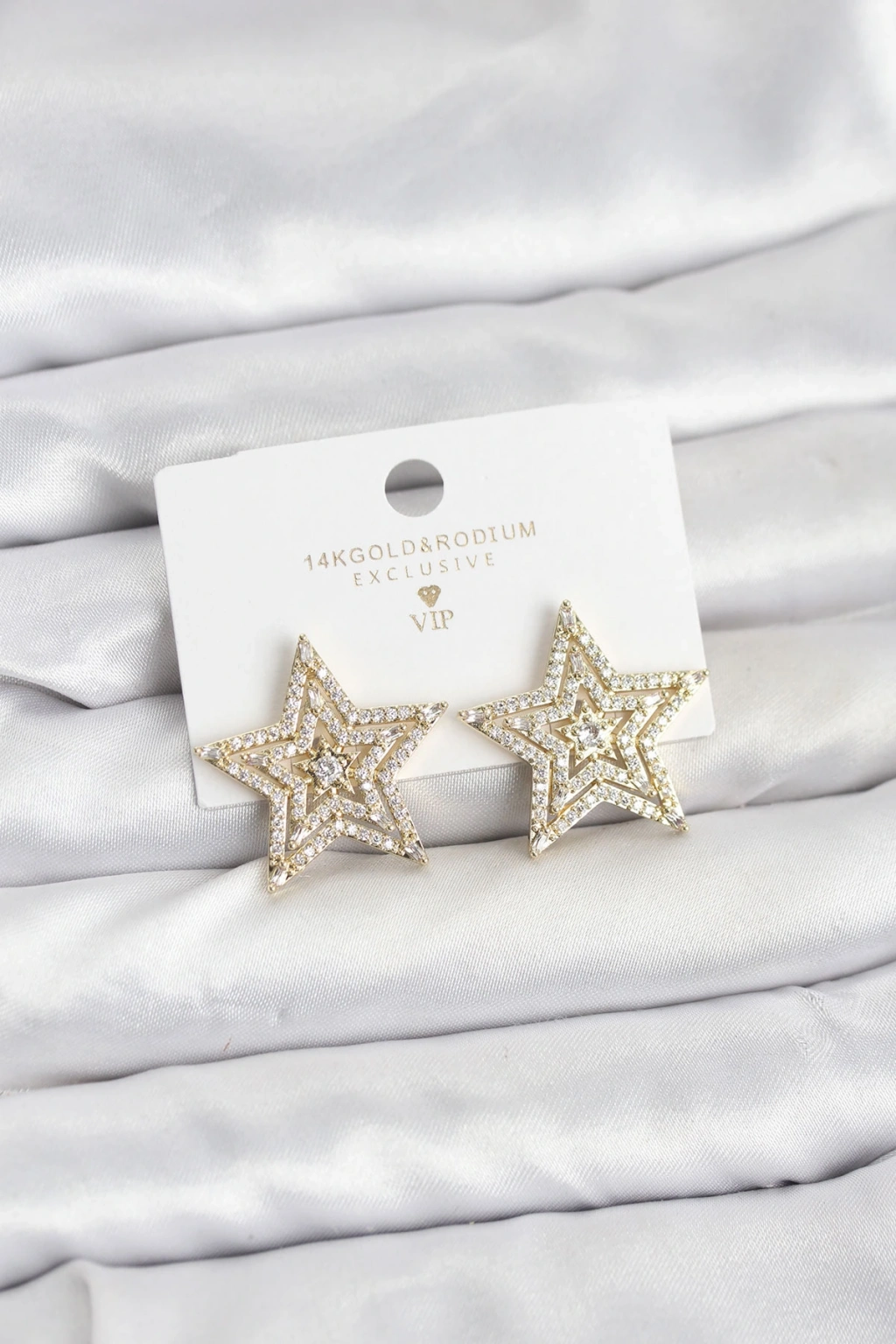 Gold Renk Pirinç Zirkon Taşlı Yıldız Model Kadın Küpe - TJ-BKP11514