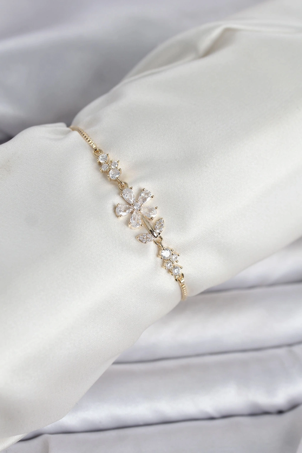 Gold Renk Zirkon Taşlı Papatya Model Asansörlü Kadın Bileklik - TJ-BB8334