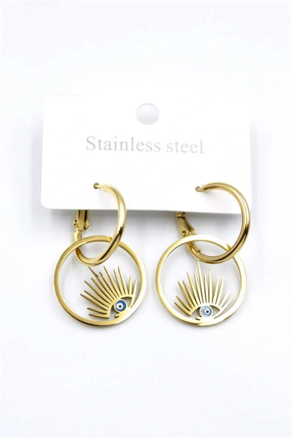 Taşlı Yıldız Çelik Halka Küpe - Altın