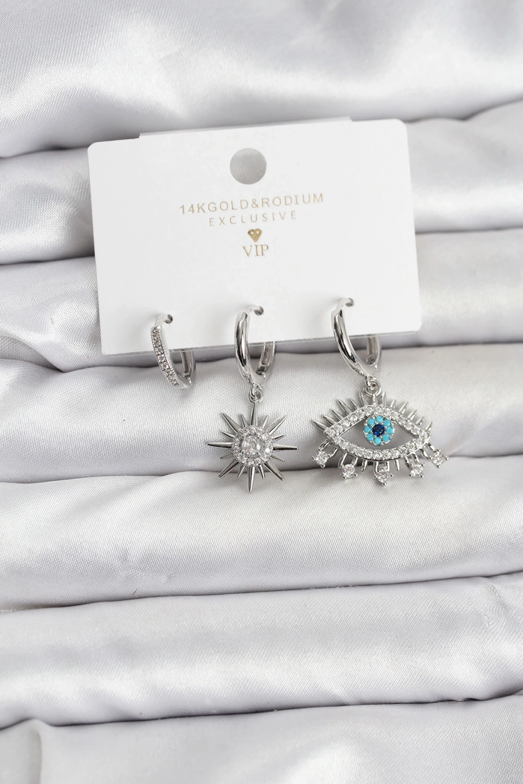 Göz Model Gümüş Renk Pirinç 3'lü Kadın Küpe Seti - TJ-BKP11440