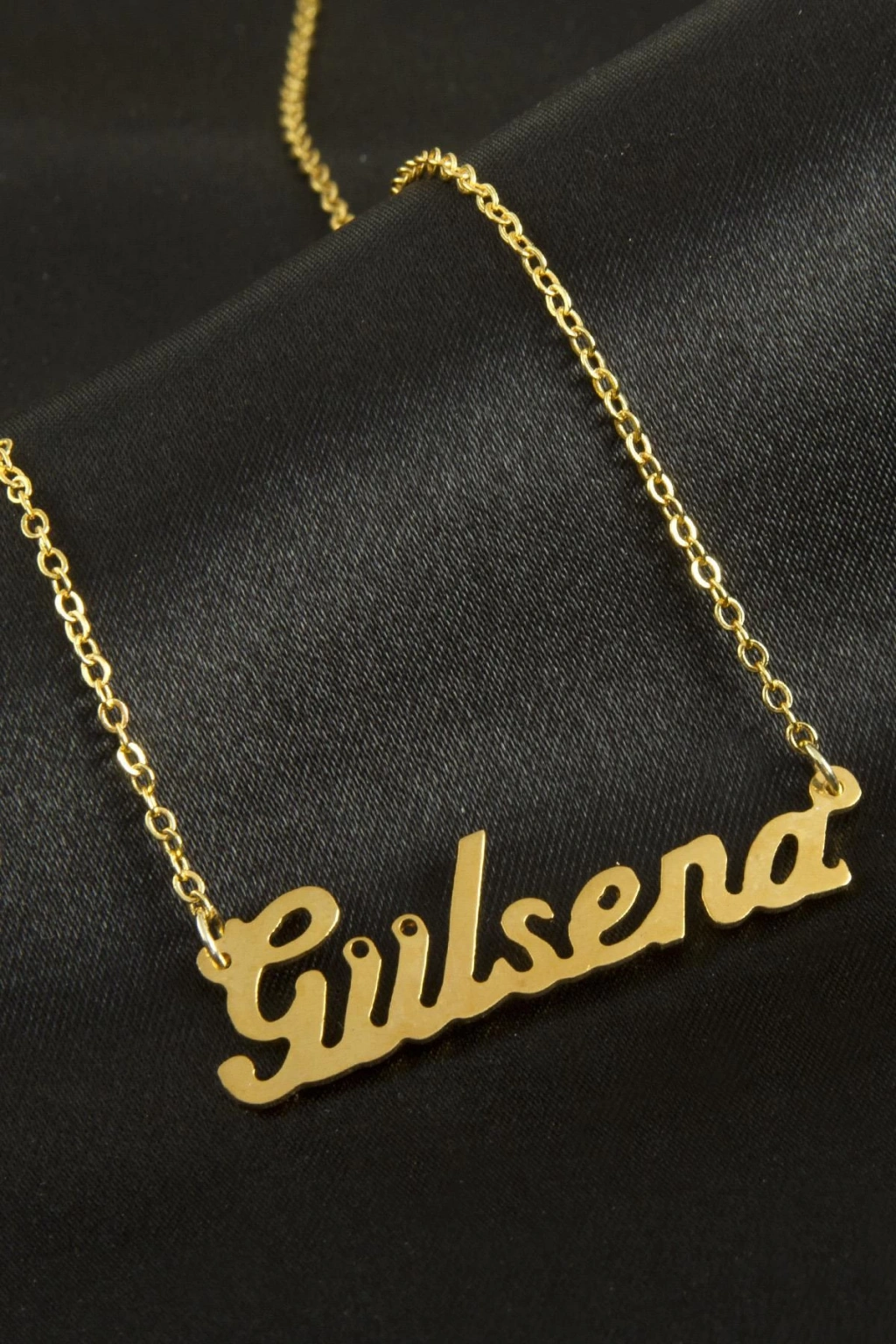 Gülsena İsimli Kolye. İsimli kolye pirinç madeninden ve altın kaplamalıdır. Kişiye özel üretilmektedir.Yazdırmak istediğiniz ismi bize mesaj olarak iletmeniz gerekmektedir. Kullanıma bağlı olarak uzun süre kullanıma uygundur. Ürün malzemesi 1.sınıf kalitededir. Ürün ve zinciri sarı renktedir. Ürün zincir boyu 45 cm ve ürün üzerindeki isimler yaklaşık 3 cmdir. İsim boyları ürün ismine göre degişiklik göstermektedir.