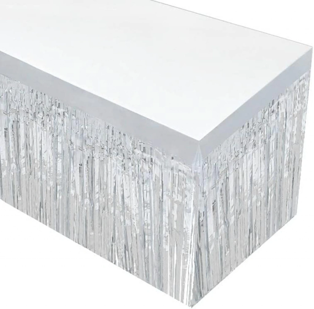 Partilerinize ve özel davetlerinize göz alıcı bir ışıltı katın! Ekstra parlak metalik folyo yapısıyla dikkat çeken bu gümüş masa eteği, masa kenarlarını şık bir şekilde süsler. 275x75 cm ölçüsündedir ve kendinden yapışkanlı yapısı sayesinde uygulaması son derece kolaydır.
