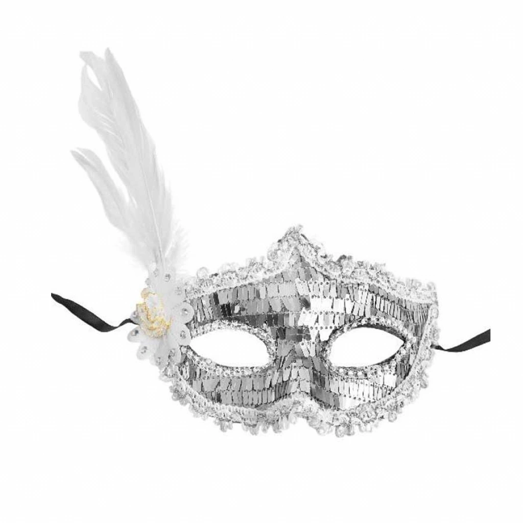 Gümüşün ışıltısı ve beyazın saflığı ile göz kamaştırmak ister misiniz? O halde size 18x22 cm boyutundaki gümüş payetli pullu beyaz renk yandan tüylü parti maskemizi sunuyoruz!