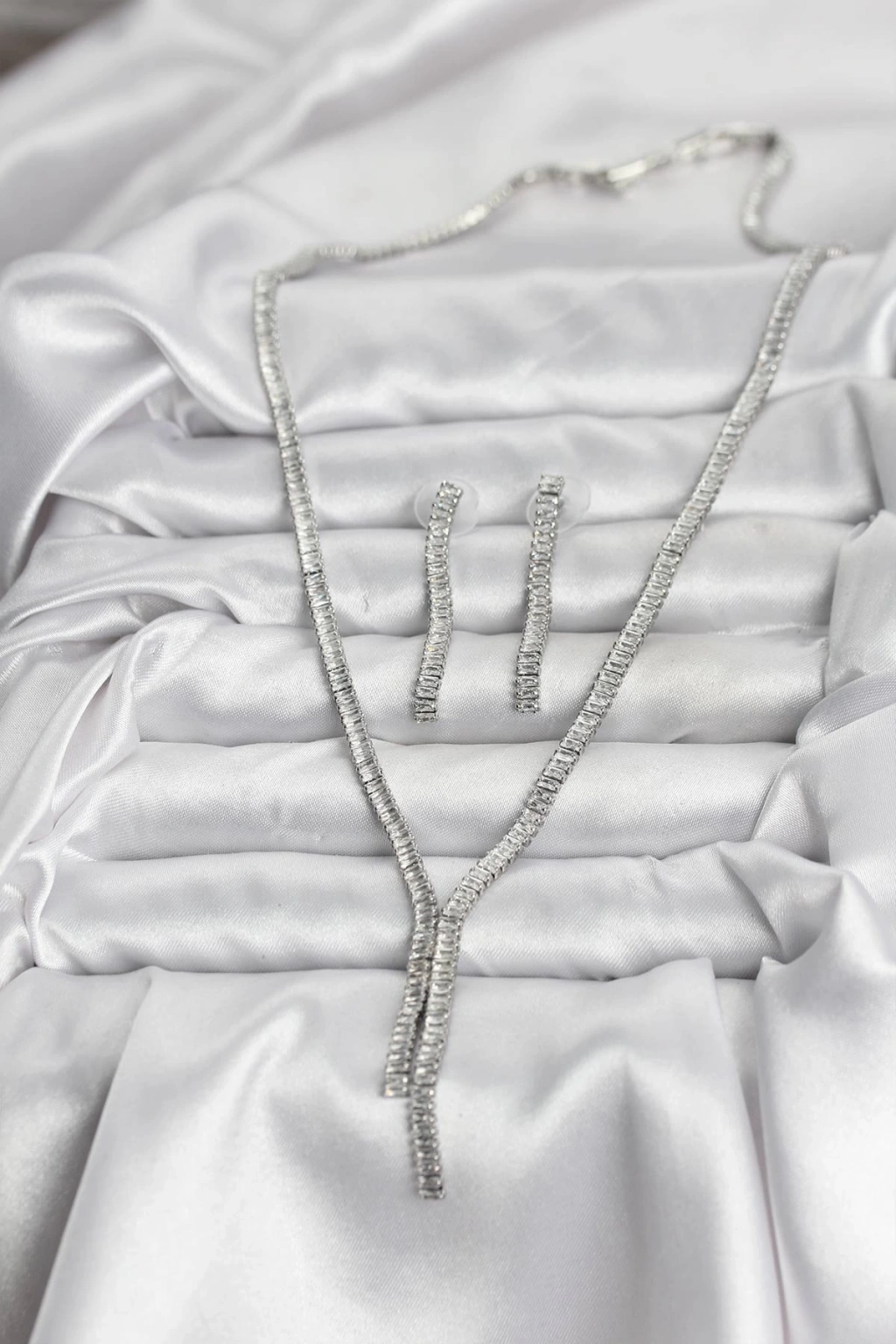 Gümüş Renk Baget Zirkon Taşlı Kadın Kolye Küpe Set - TJ-BKO10637