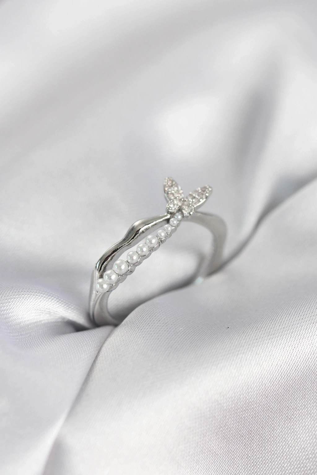 Gümüş Renk Kuyruklu Kelebek Model İncili Kadın Yüzük - TJ-BYK4091