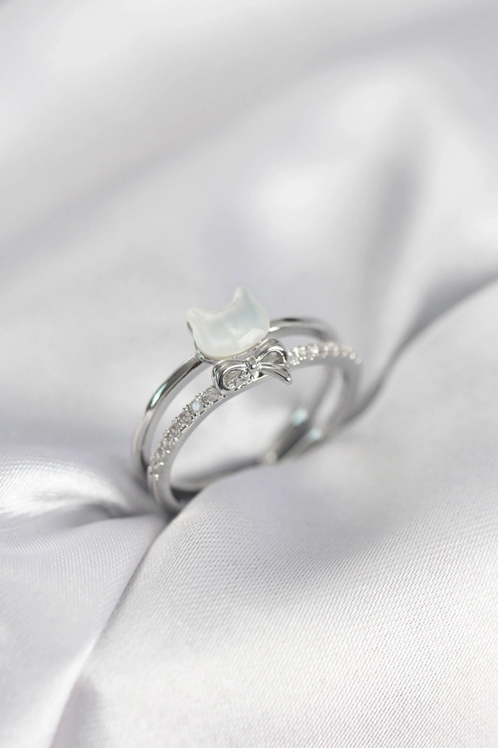 Gümüş Renk Sedefli Kedi Model Fiyonklu Zirkon Taşlı Kadın Yüzük - TJ-BYK4016