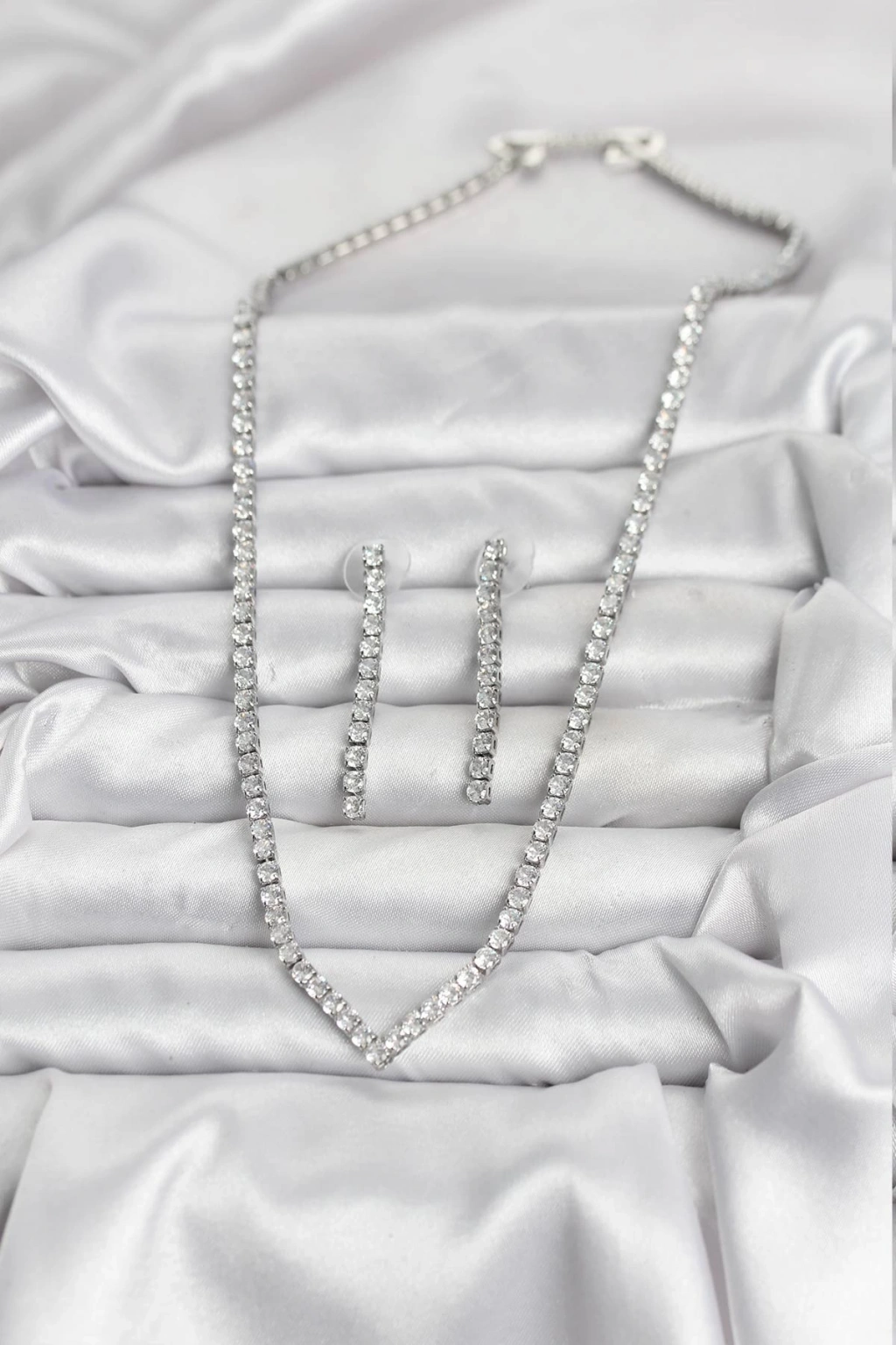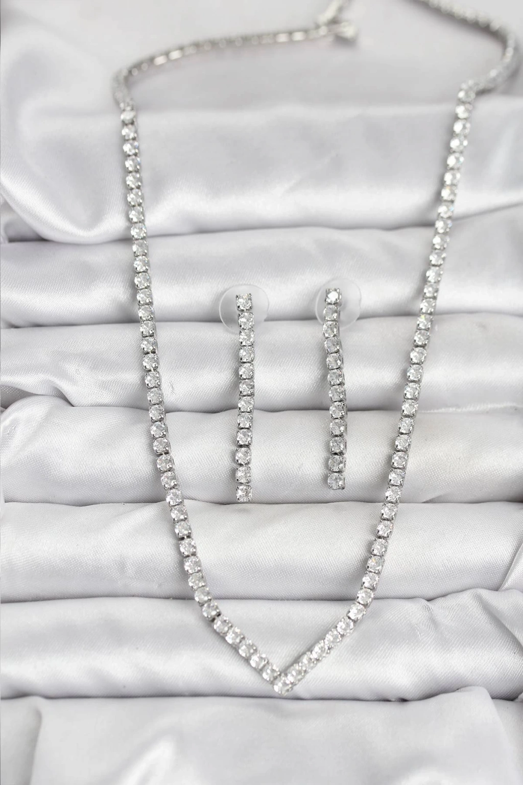 Gümüş Renk Zirkon Taşlı Kadın Kolye Küpe Seti - TJ-BKO10638