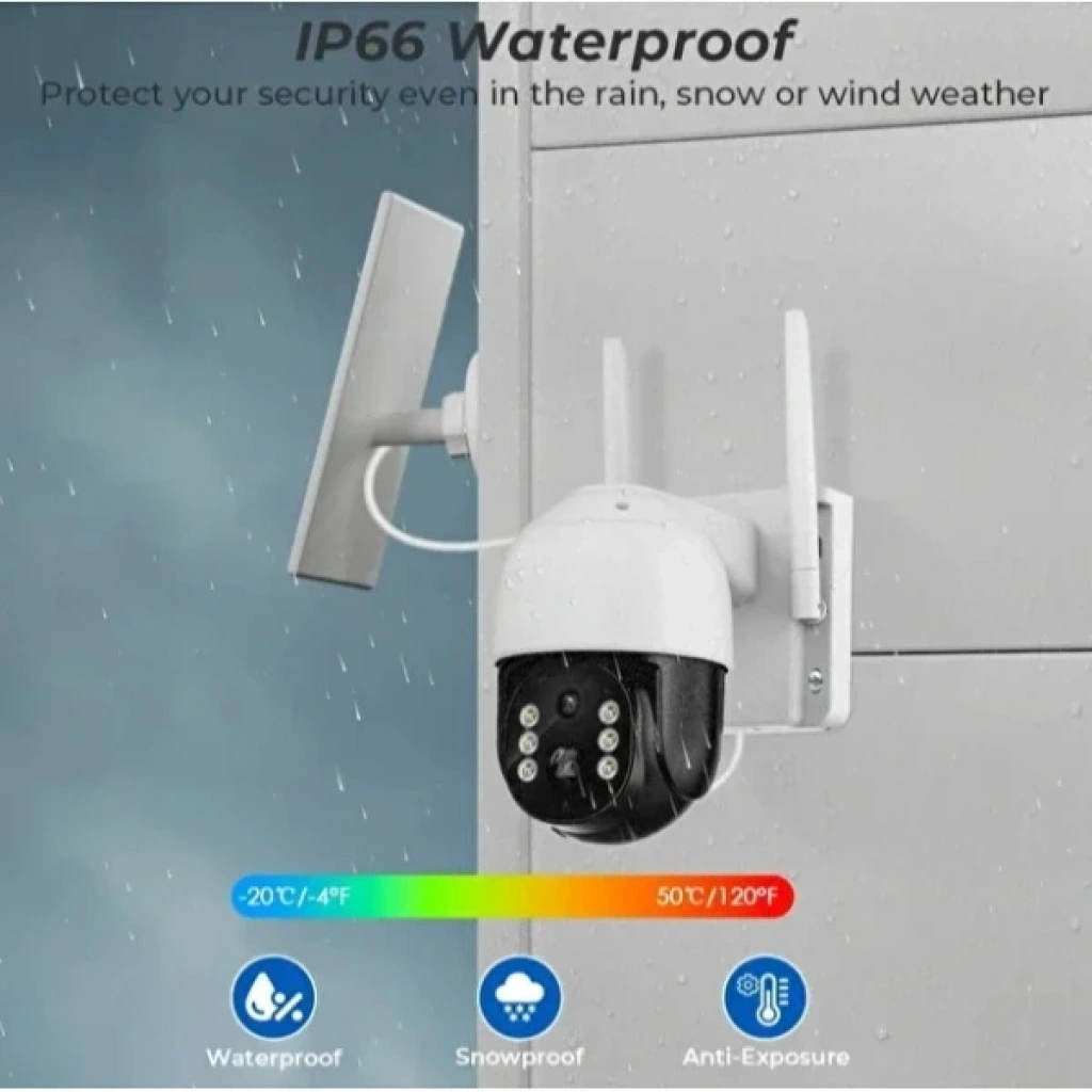 GÜNEŞ ENERJİLİ DIŞ MEKAN GÜVENLİK KAMERASIÜrün ÖzellikleriGüneş enerjili dış mekan güvenlik kamerası, çevre dostu ve kesintisiz güvenlik sağlamak için özel olarak tasarlanmıştır. Üzerindeki güçlü güneş paneli sayesinde enerji tüketimini minimuma indirir ve 8000 mAh dahili bataryasıyla uzun süreli kullanım sunar. 2.4GHz Wi-Fi bağlantısı ile kolayca ağa bağlanabilir, mobil uygulama desteği sayesinde uzaktan kontrol imkanı sağlar. Gece görüş özelliği sayesinde düşük ışıkta bile net görüntü kaydı yapabilir, tam renkli gece modu ile ayrıntılı görüntüler elde edilir. Hareket algılama teknolojisi sayesinde şüpheli aktiviteleri anında tespit eder ve mobil cihazlara alarm bildirimi gönderir. Çift yönlü ses iletişimi sağlayan dahili mikrofon ve hoparlör ile hem dinleme hem de karşı tarafla konuşma imkanı sunar. IP66 su geçirmezlik sertifikası sayesinde yağmur, kar ve toza karşı dayanıklıdır, dış mekan koşullarına karşı yüksek koruma sağlar. 360° dönebilen PTZ kontrolü ile geniş alanları tek kamera ile izlemek mümkündür. H.265 sıkıştırma teknolojisiyle yüksek kaliteli görüntüler daha düşük depolama alanı kullanılarak kaydedilir. TF kart desteği ve bulut depolama opsiyonu sayesinde görüntüler güvenle saklanabilir. Basit kurulumu ve akıllı özellikleri ile ev, iş yeri ve bahçeler için ideal bir güvenlik çözümüdür.Paket İçeriği1 adet Güneş Enerjili Dış Mekan Güvenlik Kamerası