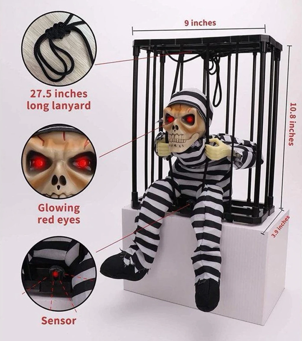 Hareketli Sesli Sensörlü Mahkum Görünümlü Kuru Kafa İskelet DekorasyonÜrün Ölçüsü : 22x27 CmÜrün Sensörlüdür , Herhangi Bir Ses Algıladığında Çalışmaya BaşlarÜrün Pil Ile Çalışmaktadır