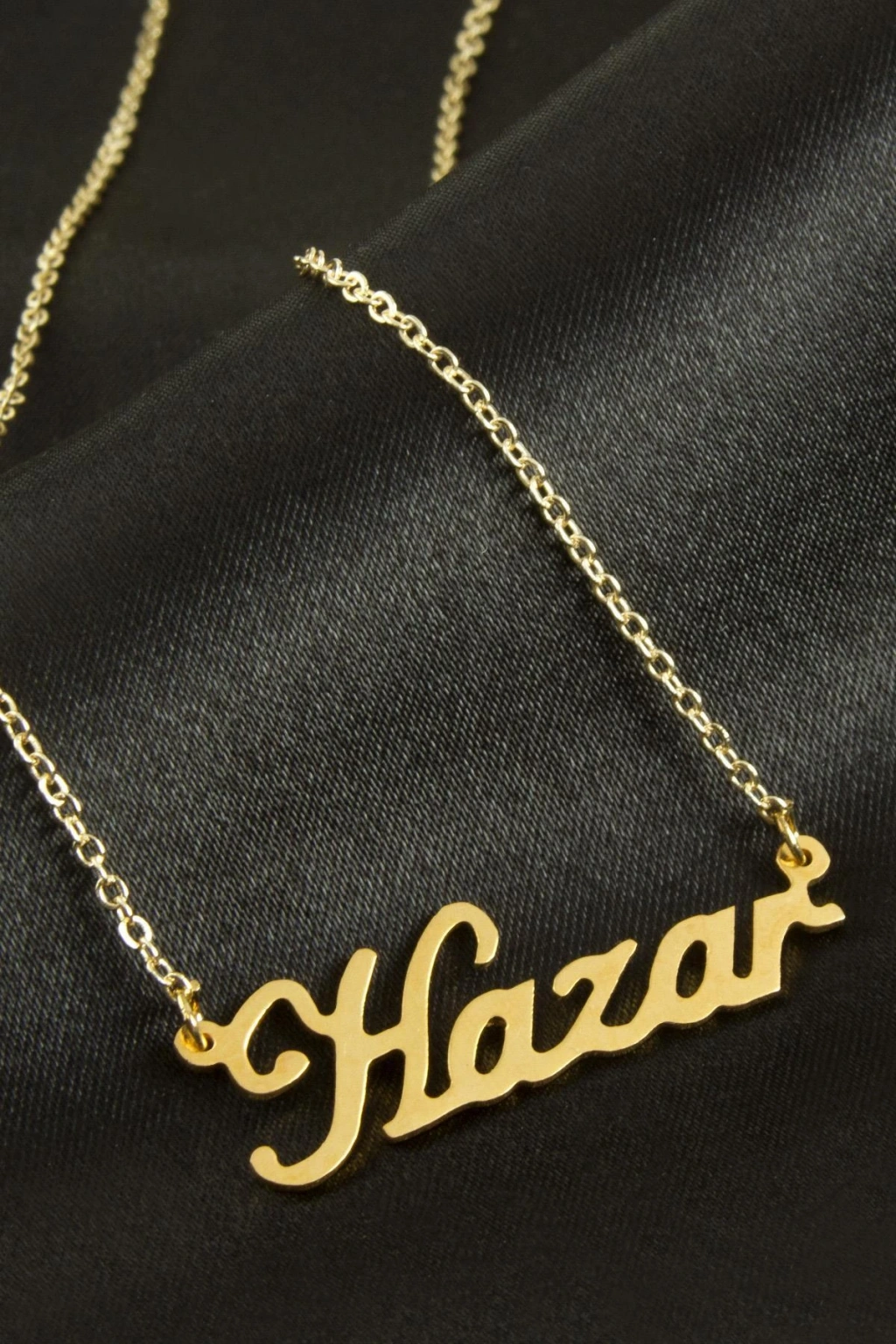 Hazar isimli kolye. İsimli kolye pirinç madeninden ve altın kaplamalıdır. Kişiye özel üretilmektedir.Yazdırmak istediğiniz ismi bize mesaj olarak iletmeniz gerekmektedir. Kullanıma bağlı olarak uzun süre kullanıma uygundur. Ürün malzemesi 1.sınıf kalitededir. Ürün ve zinciri sarı renktedir. Ürün zincir boyu 45 cm ve ürün üzerindeki isimler yaklaşık 3 cmdir. İsim boyları ürün ismine göre degişiklik göstermektedir.