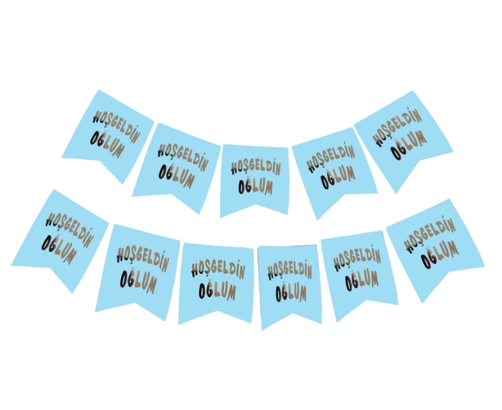 Hoşgeldin Oğlum Yazılı Mavi Üzeri Gümüş Yeni Doğan Bebek Doğum Süsü Afiş Bayrak FlamaÖlçü : 2.2 MetreRenk : Mavi Flama Üzeri Gümüş HarflerKaliteli Kağıt Malzemeden Üretilmiştir
