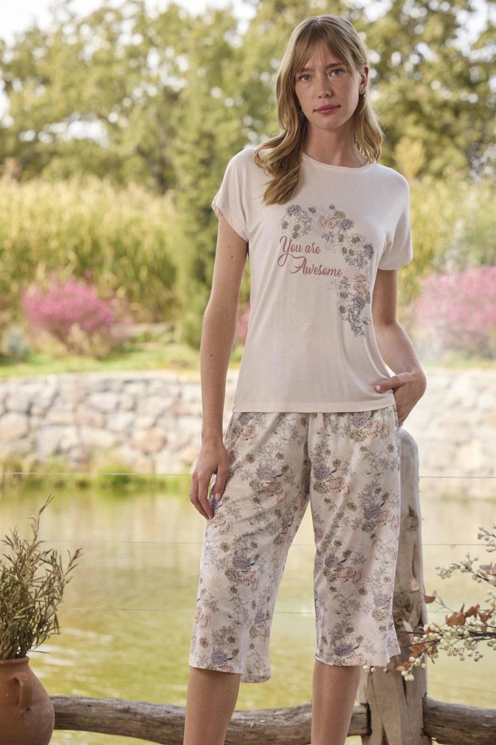 MARSiLYAN- Çiçek Desenli ve Baskılı "You are Awesome" Kapri Takımı