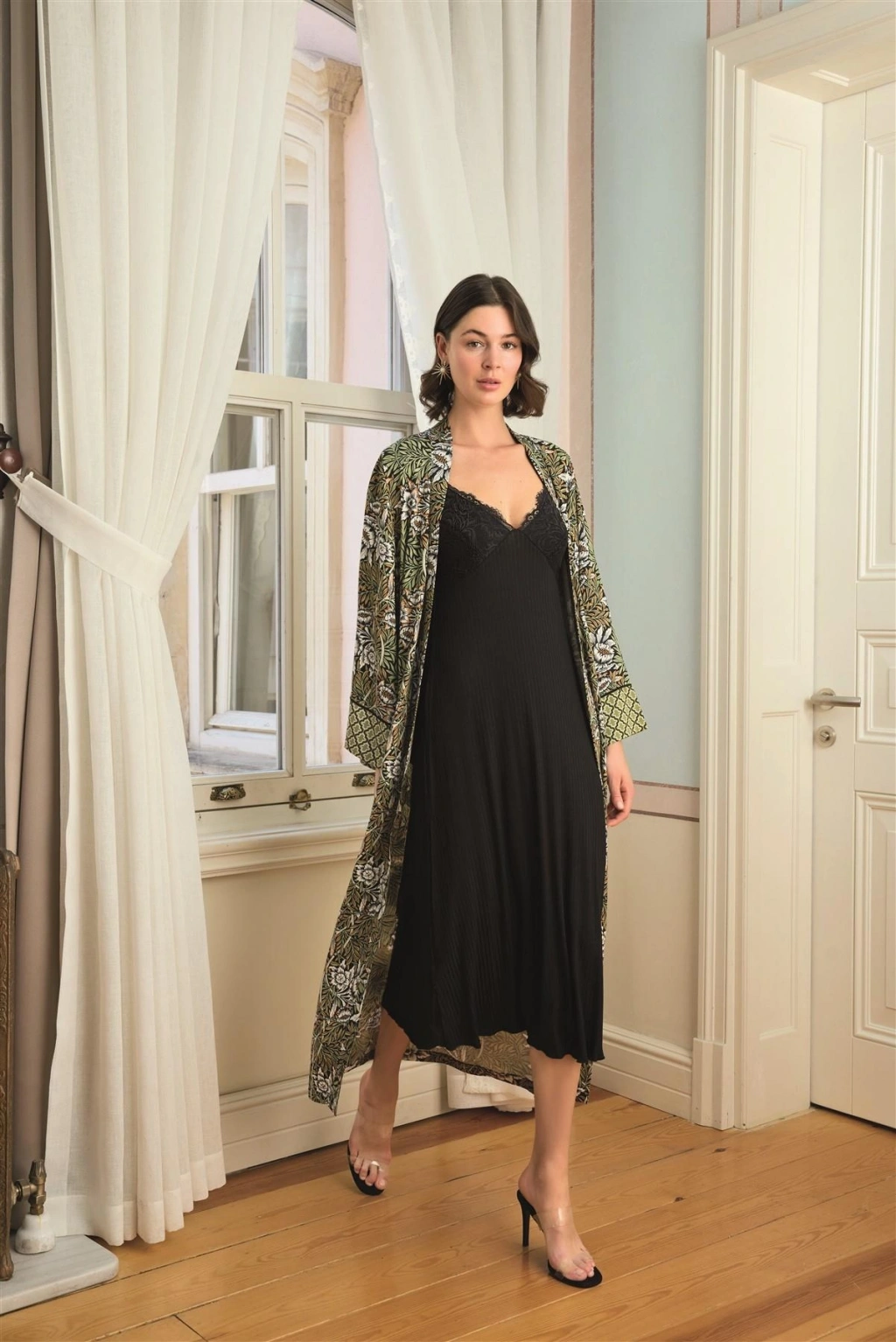 MARSiLYAN- Yaprak Desenli Yırtmaçlı Dantelli ve Dekolteli Sabahlık Takımı