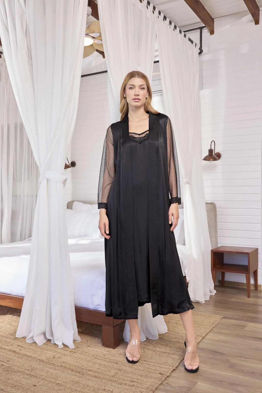MARSiLYAN- Özel Tasarım Dantel İşlemeli Şık Göğüs Dekolteli Yırtmaçlı Sabahlıklı 2'li Siyah Saten Gecelik Takımı