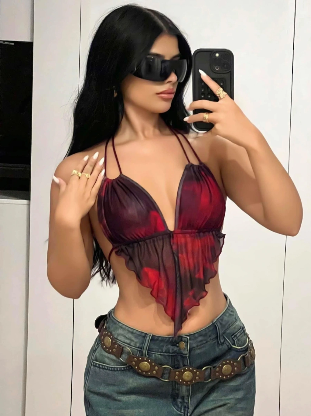 MARSiLYAN- Kırmızı Siyah Desenli İnce Askılı Üçgen Kesim Crop