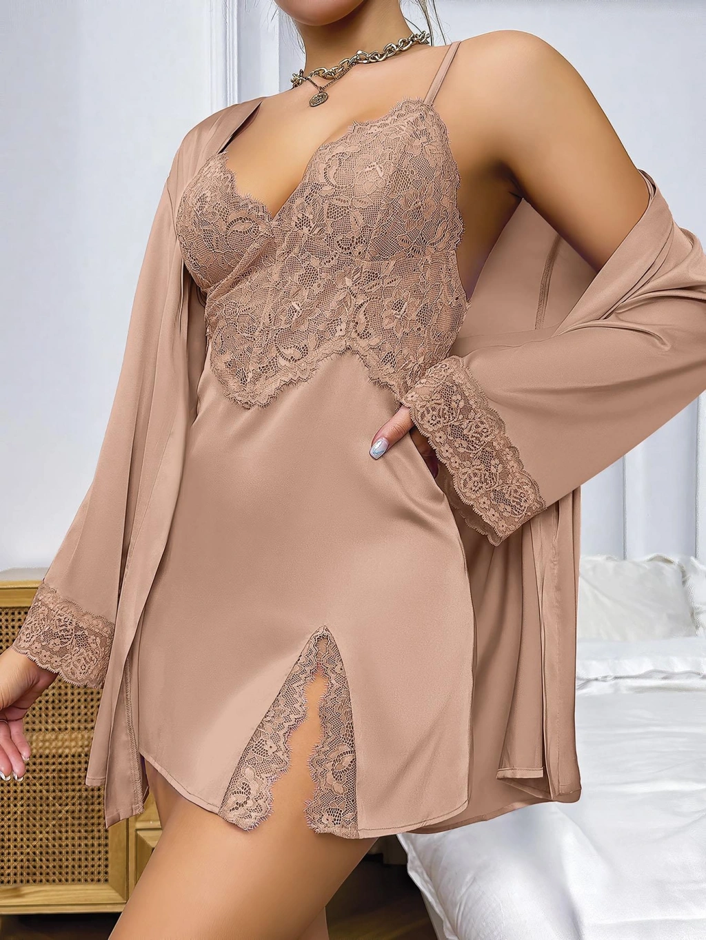 MARSiLYAN- Özel Tasarım Şık Dantel İşlemeli Sabahlıklı 2'li Pudra Saten Gecelik Takımı