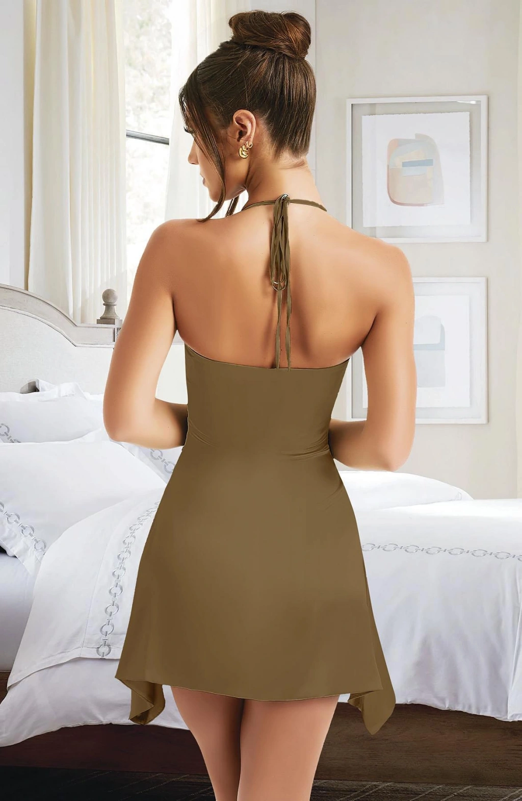 MARSiLYAN- Özel Tasarım İnce Askılı Boyundan Bağlamalı Koyu Yeşil Mini Saten Gecelik