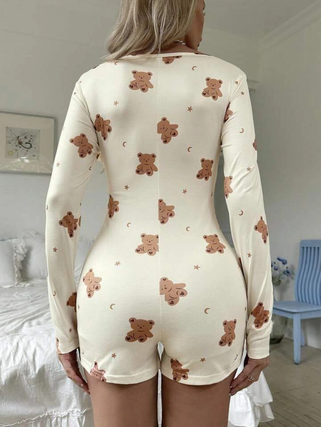 MARSiLYAN- Pamuklu Ekru Ayıcık Desenli Düğmeli Tulum Pijama
