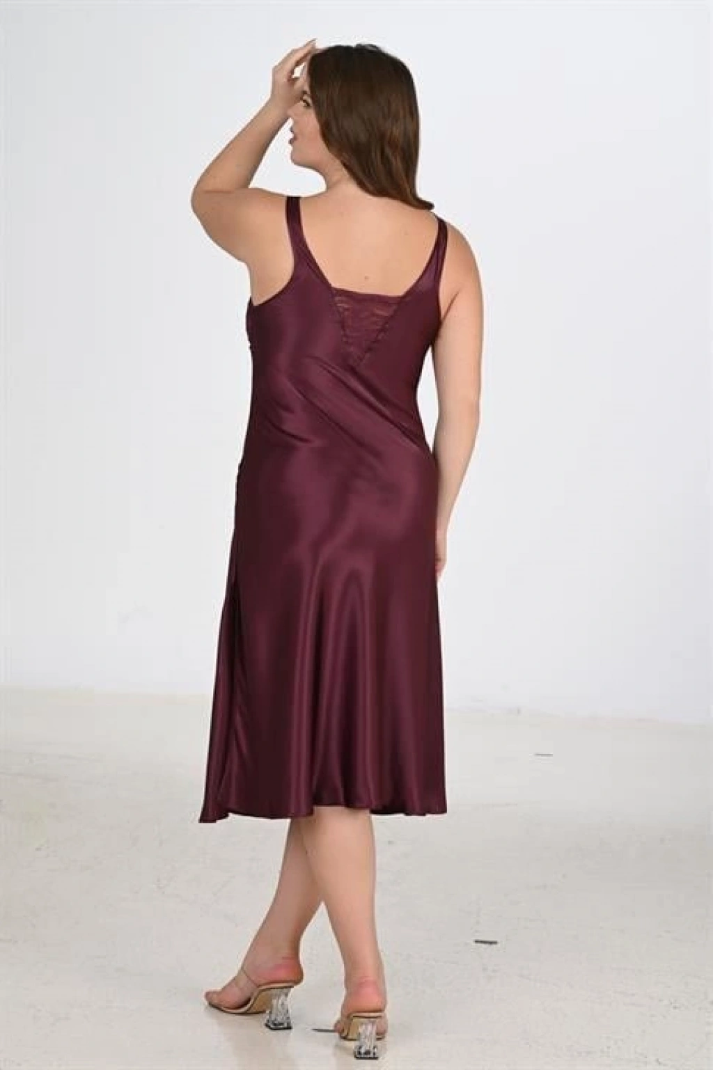 MARSiLYAN- Premium Büyük Beden Saten Dantel İşlemeli Mürdüm Uzun 2'li Gecelik Sabahlık Takımı Bigsize