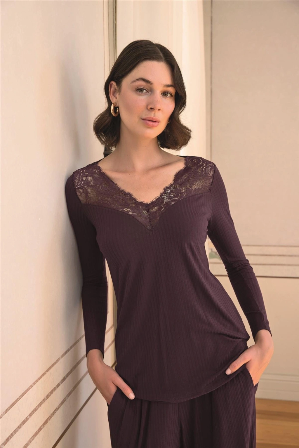 MARSiLYAN- Uzun Kollu Dantelli ve Dekolteli Pijama Takımı