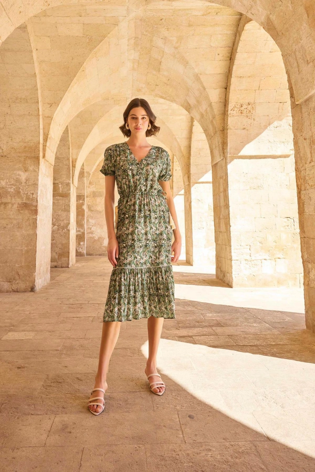 MARSiLYAN- %100 Viskon Çiçek ve Yaprak Desenli Önü Düğmeli Elbise