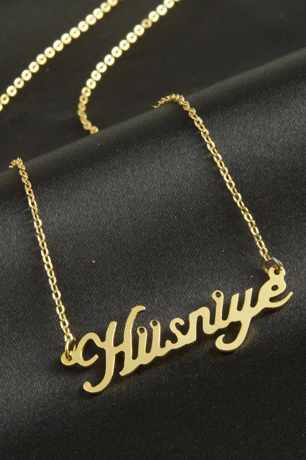 Hüsniye isimli kolye. İsimli kolye pirinç madeninden ve altın kaplamalıdır. Kişiye özel üretilmektedir.Yazdırmak istediğiniz ismi bize mesaj olarak iletmeniz gerekmektedir. Kullanıma bağlı olarak uzun süre kullanıma uygundur. Ürün malzemesi 1.sınıf kalitededir. Ürün ve zinciri sarı renktedir. Ürün zincir boyu 45 cm ve ürün üzerindeki isimler yaklaşık 3 cmdir. İsim boyları ürün ismine göre degişiklik göstermektedir.