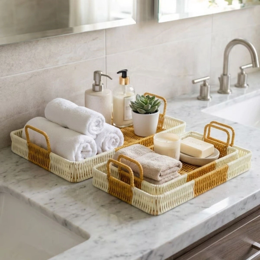 Plastik Rattan 3’lü Dikdörtgen Tepsi Seti, şık tasarımı ve pratik kullanımıyla mutfaktan bahçeye her alanda estetik ve düzen sağlar. Doğal rattan (hasır) görünümlü dokusu sayesinde hem klasik hem modern dekorasyonlara uyum sağlar. Çift renkli tasarımı ile sunumlarınıza zarif bir hava katar.