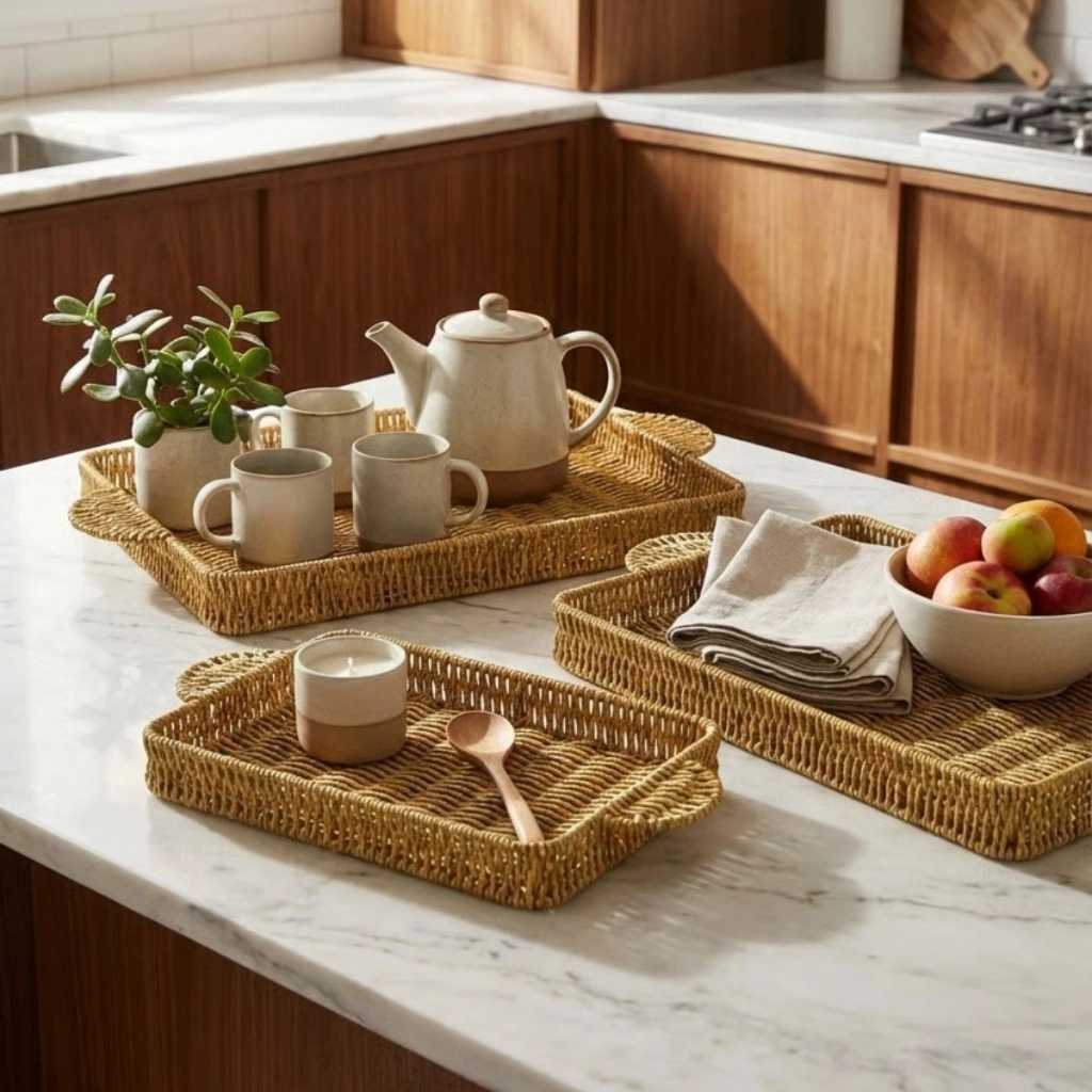 Dayanıklı plastik rattan malzemeden üretilen bu tepsi seti; kahvaltı, çay, kahve, ikram ve atıştırmalık sunumları için idealdir. Hafif ama sağlam yapısı sayesinde günlük kullanıma uygundur. Aynı zamanda salon, balkon ve masaüstlerinde dekoratif sunum tepsisi veya organizer olarak da tercih edilebilir.