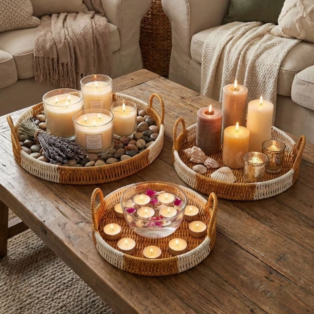 İç İçe Geçebilen 3’lü Yuvarlak Plastik Rattan Tepsi Seti, doğal hasır dokusunu modern çift renkli tasarımla birleştirerek sofralarınıza şıklık ve pratiklik kazandırır. Yuvarlak formu sayesinde dengeli ve estetik bir sunum imkânı sunar.