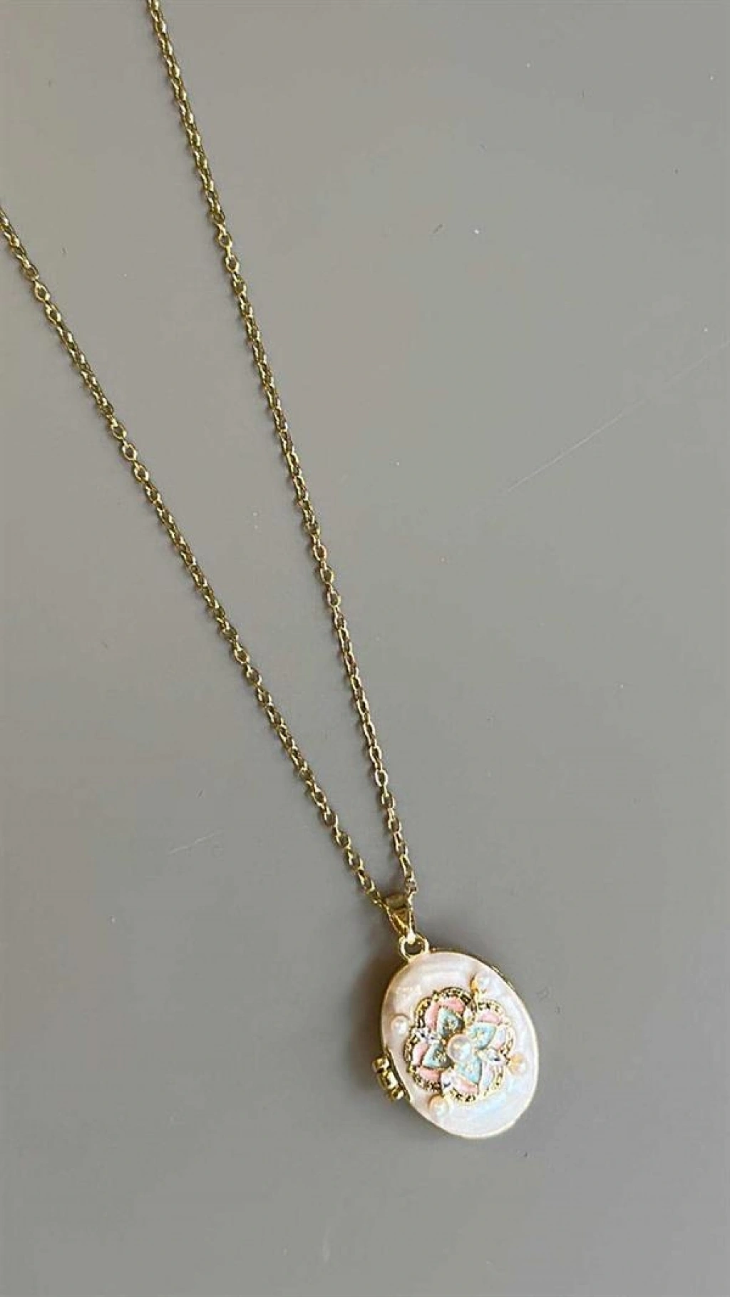 İncili Etnik Desen Kapaklı Kolye - Beyaz