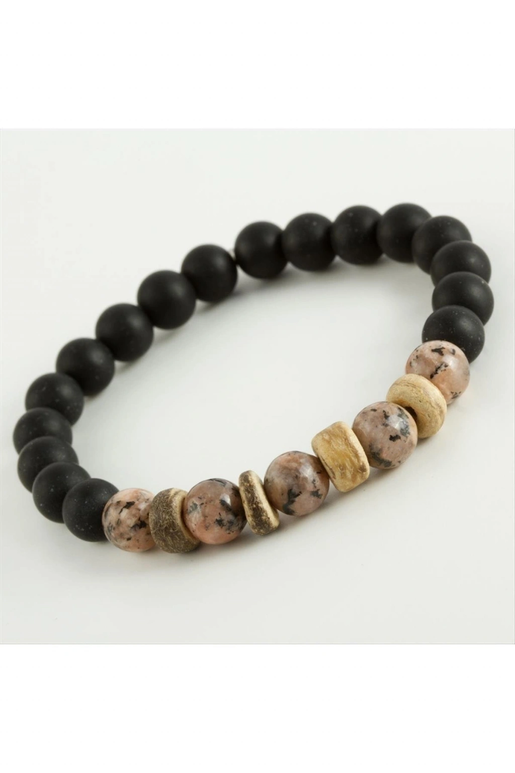 Doğaltaş Bileklik; Ürün malzemesi akik ve mat onix doğaltaştan imal edilmiştir. Ürün malzemesi misina üzerine dizilmiştir.