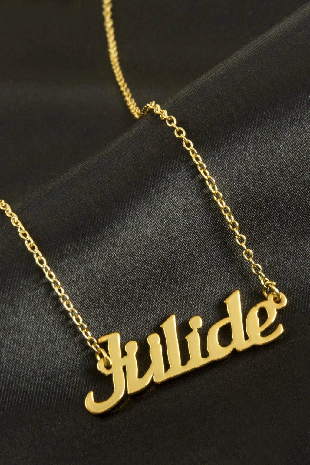 Jülide isimli kolye. İsimli kolye pirinç madeninden ve altın kaplamalıdır. Kişiye özel üretilmektedir.Yazdırmak istediğiniz ismi bize mesaj olarak iletmeniz gerekmektedir. Kullanıma bağlı olarak uzun süre kullanıma uygundur. Ürün malzemesi 1.sınıf kalitededir. Ürün ve zinciri sarı renktedir. Ürün zincir boyu 45 cm ve ürün üzerindeki isimler yaklaşık 3 cmdir. İsim boyları ürün ismine göre degişiklik göstermektedir.
