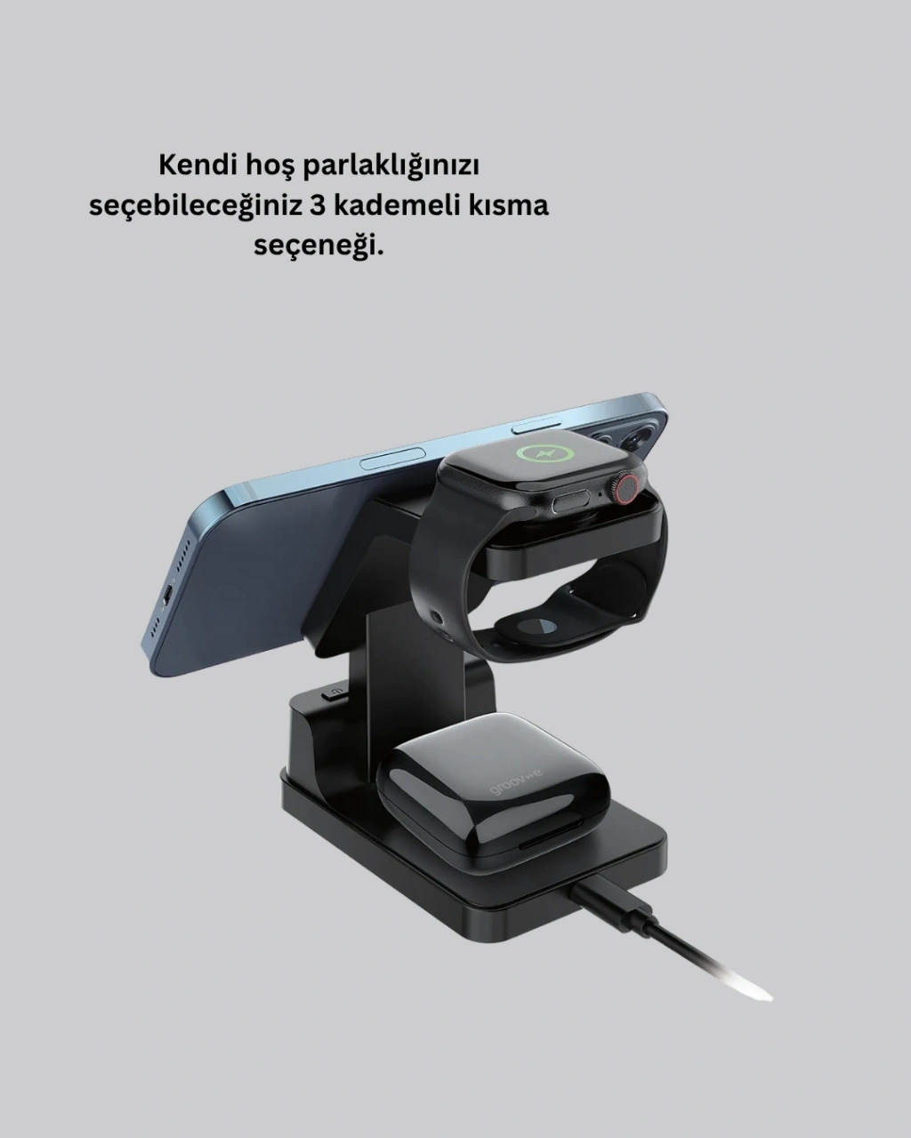 Tek bir cihaz, üç işlev!Bu kablosuz şarj istasyonu; hızlı şarj, LED dijital saat ve zarif masa aksesuarı olarak tasarlandı.Apple cihazlarınızla tam uyumlu yapısı sayesinde iPhone, AirPods ve Apple Watch’u aynı anda şarj eder.Dijital saat ekranında 3 parlaklık seviyesi ve 12/24 saat formatı bulunur.Geceleri rahatsız etmeyen, gündüzleri net okunabilir bir ekran deneyimi sunar.Akıllı çip sistemi, cihazı tanır ve uygun şarj gücünü otomatik olarak uygular.ABS yanmaz malzeme, güvenli kullanım sunarken uzun ömürlü dayanıklılık sağlar.Kutu içeriğinde QC 3.0 adaptör, 1.5 metre Type-C kablo ve kullanım kılavuzu bulunur.Şık kutu tasarımıyla hediye olarak sunmak için de mükemmeldir.