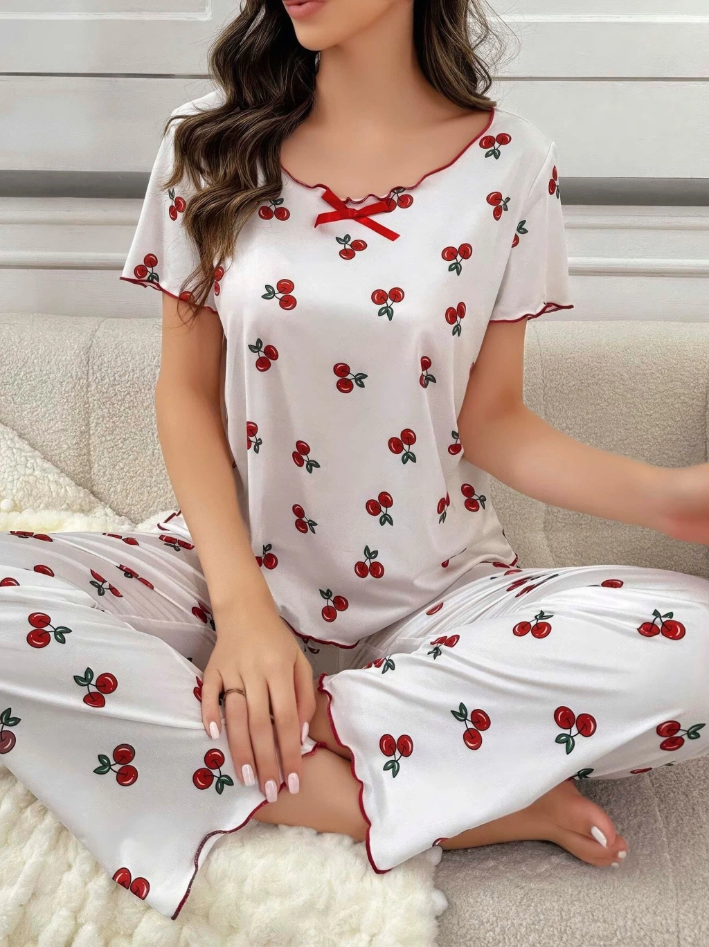 Kadın Beyaz Kiraz Desenli Kısa Kollu Yumuşak Pijama Takımı 5128