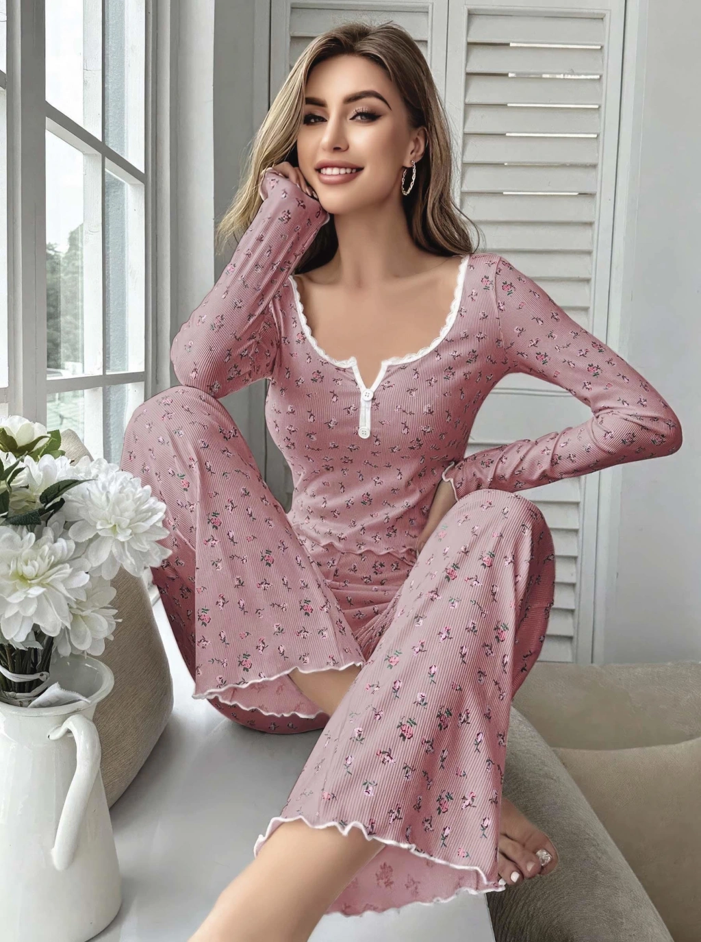 Kadın Çiçekli Desen Yumuşak Pamuklu Uzun Pijama Takımı 5131