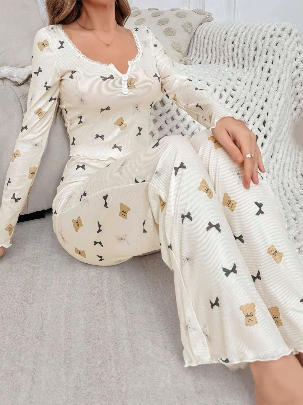 Kadın Ekru Ayıcık ve Fiyonk Desenli Yumuşak Pamuklu Uzun Pijama Takımı 5129
