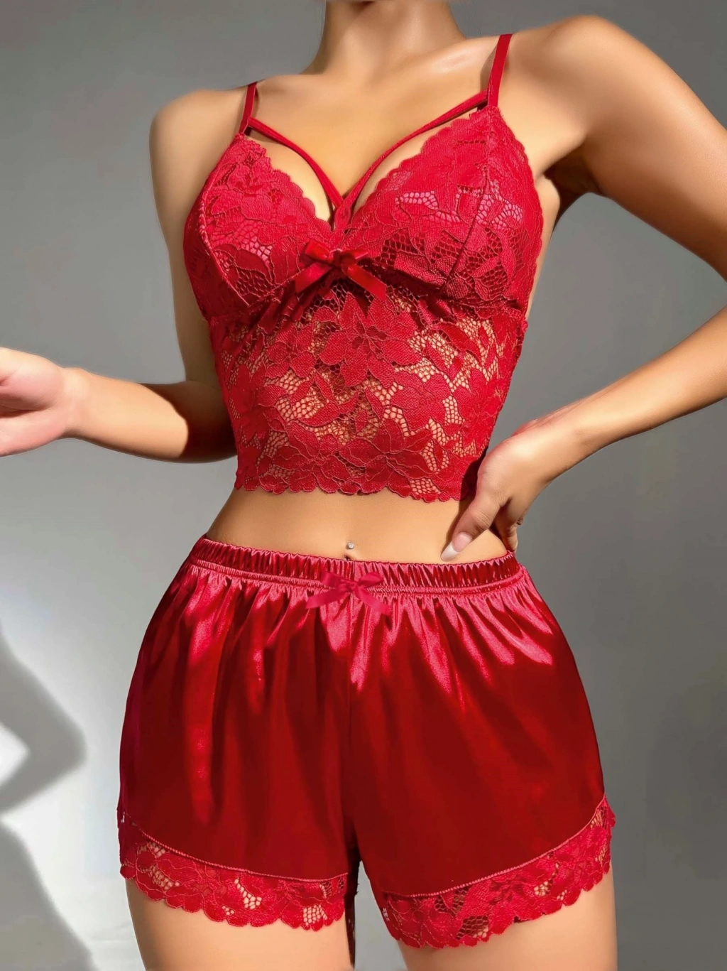 Kadın Kırmızı Dantel Detaylı Şortlu Takım Saten Gecelik 2293