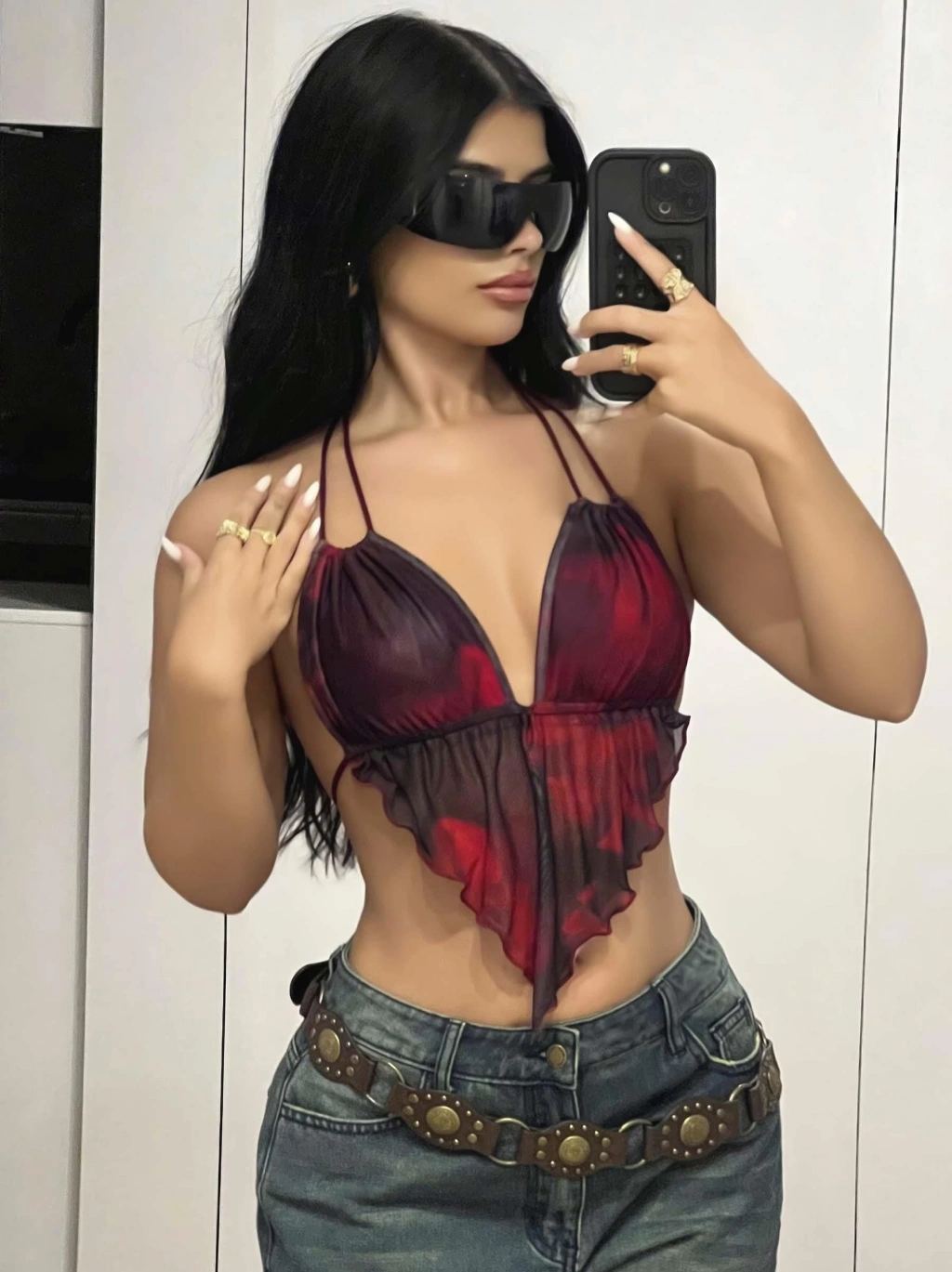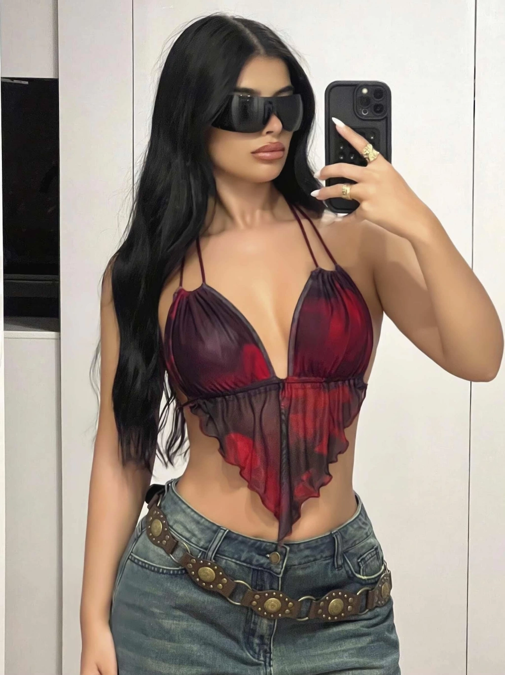 Kadın Kırmızı Siyah Renklerde Önden Üçgen Kesim Detaylı Crop Askılı Önden Bağlama 5092