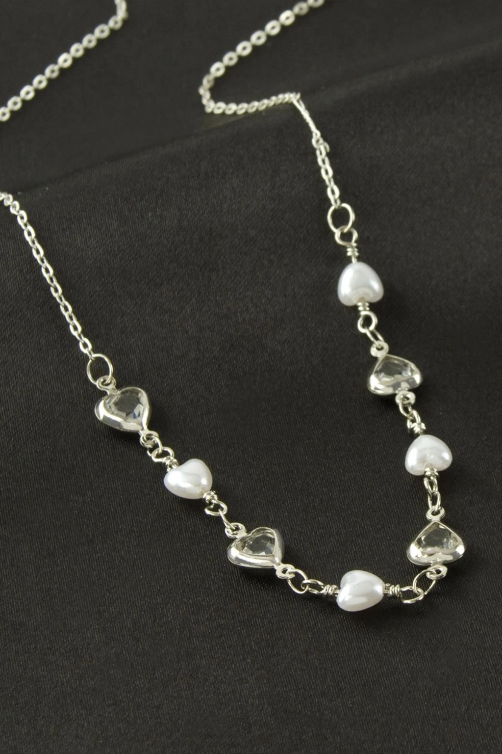 Kolye; Ürün malzemesi inci, metal ve kristal taşlıdır. Ürün zincir uzunluğu 45 cmdir. Kartlıdır.