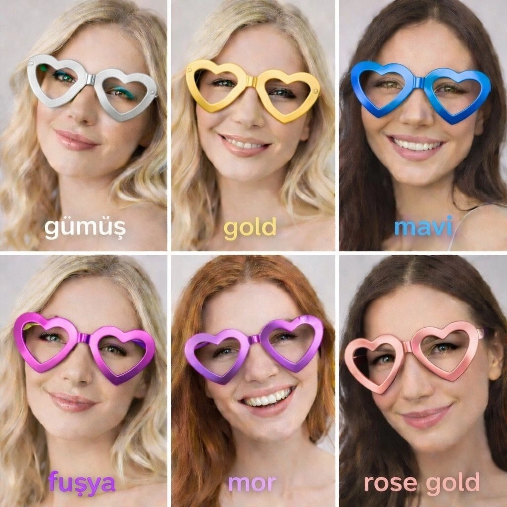 KALP ŞEKİLLİ CAMSIZ PARTİ GÖZÜĞÜ 12 ADET – 6 RENKÜrün ÖzellikleriKalp Şekilli Camsız Parti Gözlüğü, sevgi dolu ve enerjik tasarımıyla tüm organizasyonlarınızı bir festival havasına çeviriyor. Kalp formundaki özel tasarımı ve metalik parlaklıktaki yüzeyiyle stilinize neşe katan bu parti gözlüğü, camsız yapısı sayesinde görüşünüzü etkilemeden gece boyu konforlu bir kullanım sunar. Dayanıklı ve esnek plastik çerçeve yapısı, her yüz tipine uyum sağlarken ultra hafifliği sayesinde yokmuş gibi bir his yaratır. Set içerisinde Gümüş, Mavi, Rose Gold, Fuşya, Mor ve Altın olmak üzere 6 farklı canlı renk seçeneği bulunur. Toplam 12 adetlik paketiyle bekarlığa veda partileri, düğün sonrası eğlenceler (after party), doğum günleri ve festival konseptleri için harika bir grup aksesuarıdır. Fotoğraf çekimlerinde (photobooth) sevdiklerinizle birlikte unutulmaz ve eğlenceli kareler yakalamanızı sağlayacak bu kalp gözlük seti, partinizin en çok konuşulan detaylarından biri olacak.Ürün Teknik ÖzellikleriÖzellikAçıklamaÜrün AdıKalp Şekilli Camsız Parti Gözlüğü 12 Adet – 6 RenkTasarımKalp Formunda, Camsız ve HafifMateryalDayanıklı Parlak Kaplamalı PlastikMiktar12 Adet (Her renkten 2'şer adet)Renk SeçenekleriGümüş, Mavi, Rose Gold, Fuşya, Mor, AltınFonksiyonKostüm Tamamlayıcı, Fotoğraf AksesuarıKullanım AlanıParti, Festival, Bekarlığa Veda, After Party, PhotoboothPaket İçeriği12 Adet Kalp Şekilli Camsız Parti Gözlüğü (6 Farklı Renk Kombinasyonu)