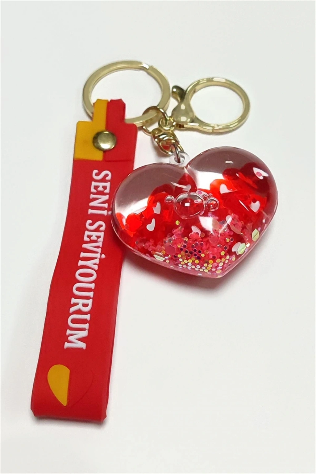 Anahtarlık; Ürün malzemesi silikon ve metaldir. Ürün boyu 18 cmdir. 1 sınıf kaliteli malzemeden üretilmiştir. Ürün içersindeki kalp içinde su ve pullar vardır.