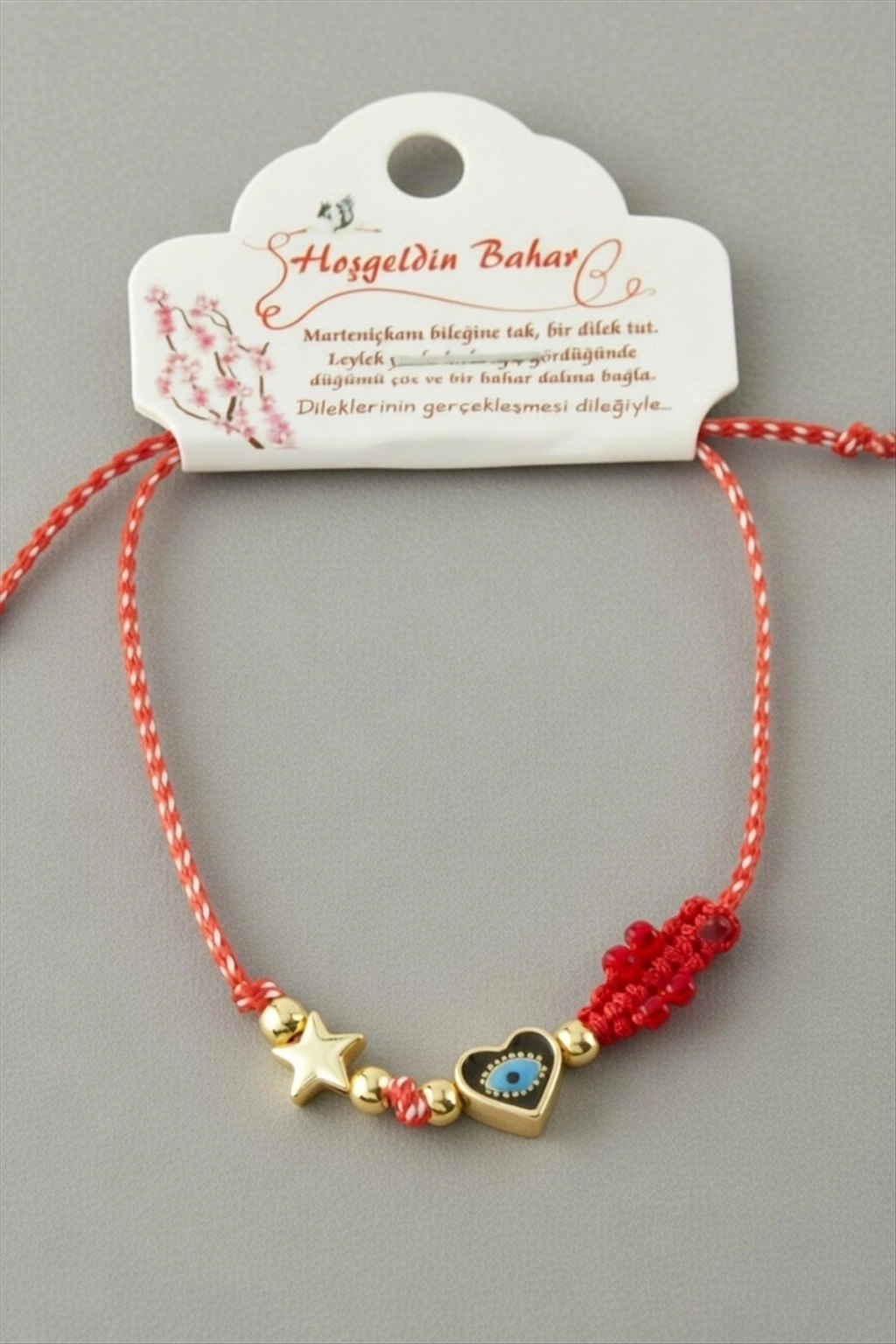 Bileklik; Ürün malzemesi mine boyama, metal, kore ip ve marteniçka ipten üretilmiştir. Ürün arkası asansörlüdür. Bileğe göre ayarlanabilir. Kartlıdır.