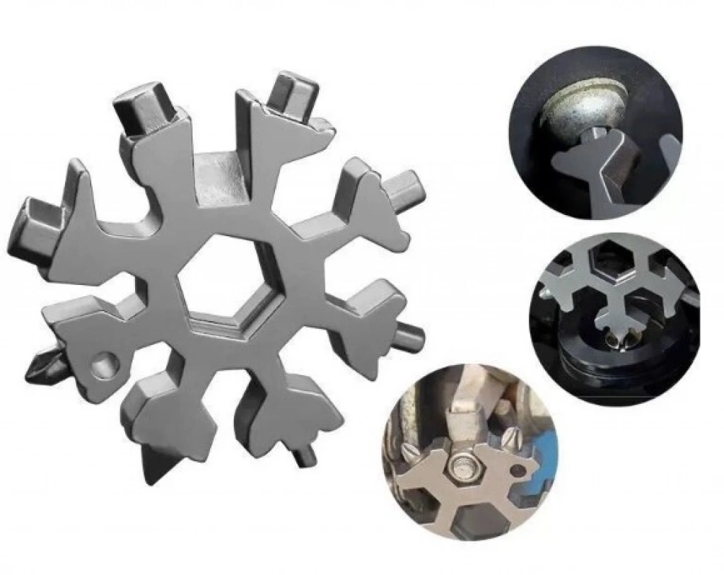 Kar Tanesi Çok Amaçlı Anahtarlık AçacakÜrün ÖzellikleriKar tanesi anahtarları son derece çok yönlüdür. Şişe açacağı, kutu açacağı, tornavida, emniyet çekiç, altıgen anahtar vb. Olarak kullanılabilir.18+1 çeşit düz yıldız tornavida, alyan, civata anahtarı, meşrubat açacağı, koli kesme gibi bir çok işlerinizi tek ürünle çözebilirsiniz.Avuç içine sığan küçük boyutu ile cebinizde veya çantanızda kolaylıkla taşıyabilirsiniz.Paslanmaz çelikten üretilmiştir.Her evde, araçta ve özellikte bisiklette motosiklet gibi ulaşım araçlarında bulunması gereken müthiş bir ürün.Dağcılık veya yürüyüş gibi açık hava sporlarında yanınıza almalısınız. Paket İçeriği1 Adet Kar Tanesi Çok Amaçlı Anahtarlık Açacak