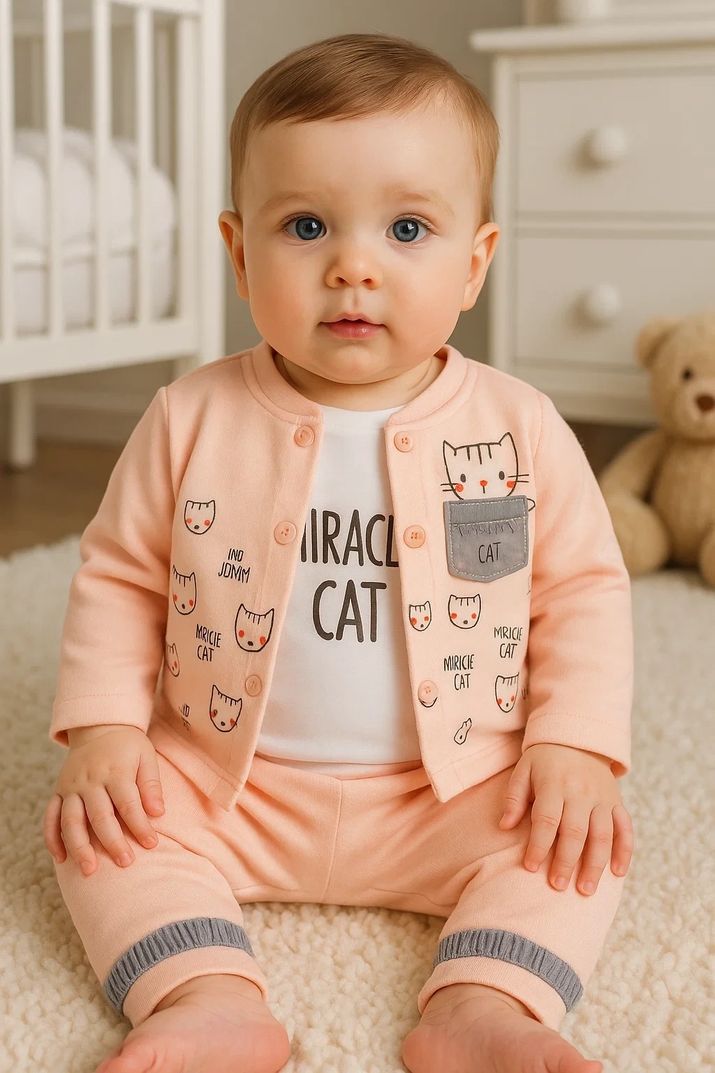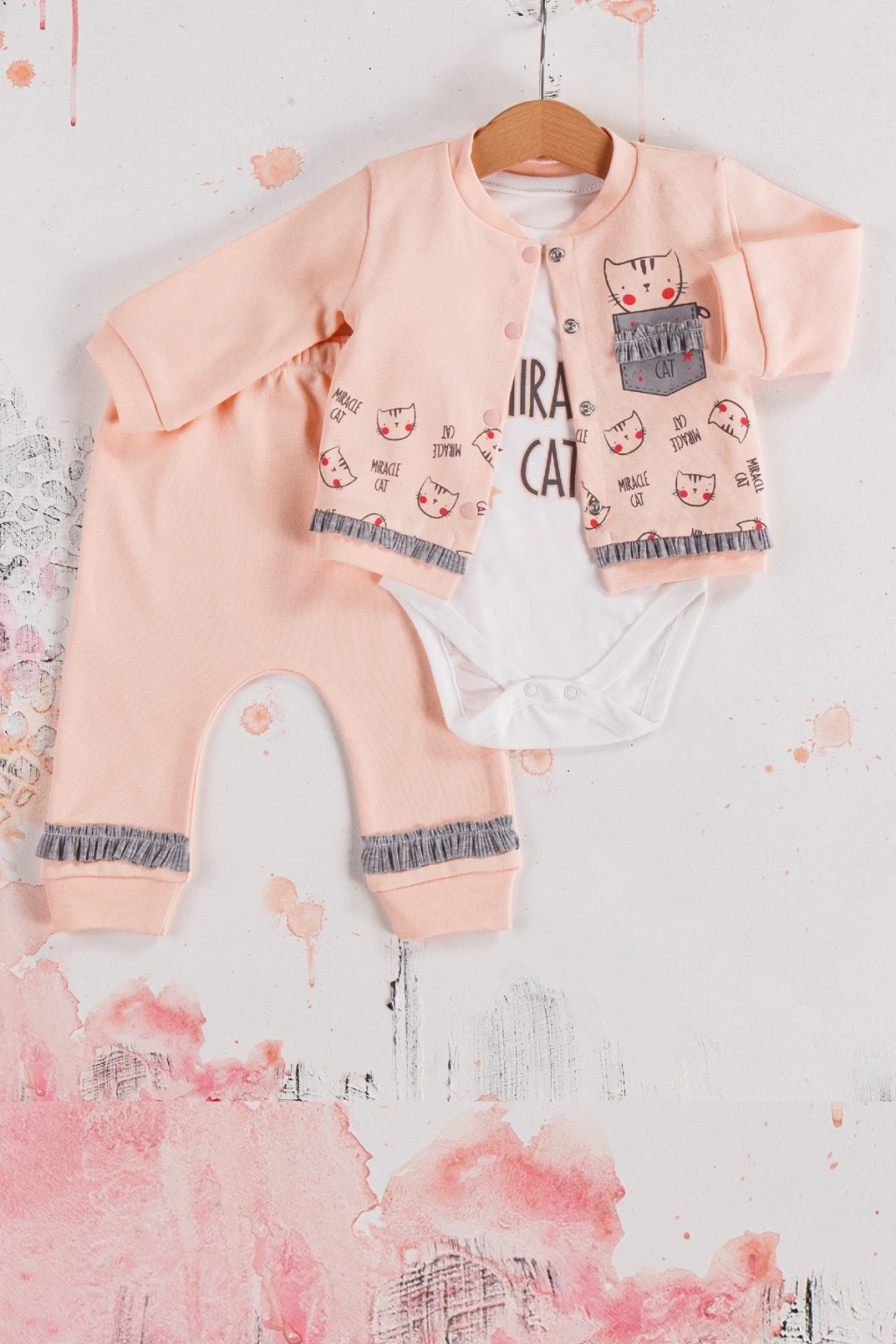 Kedi Desenli 3'lü Hırkalı Kız Bebek Takım