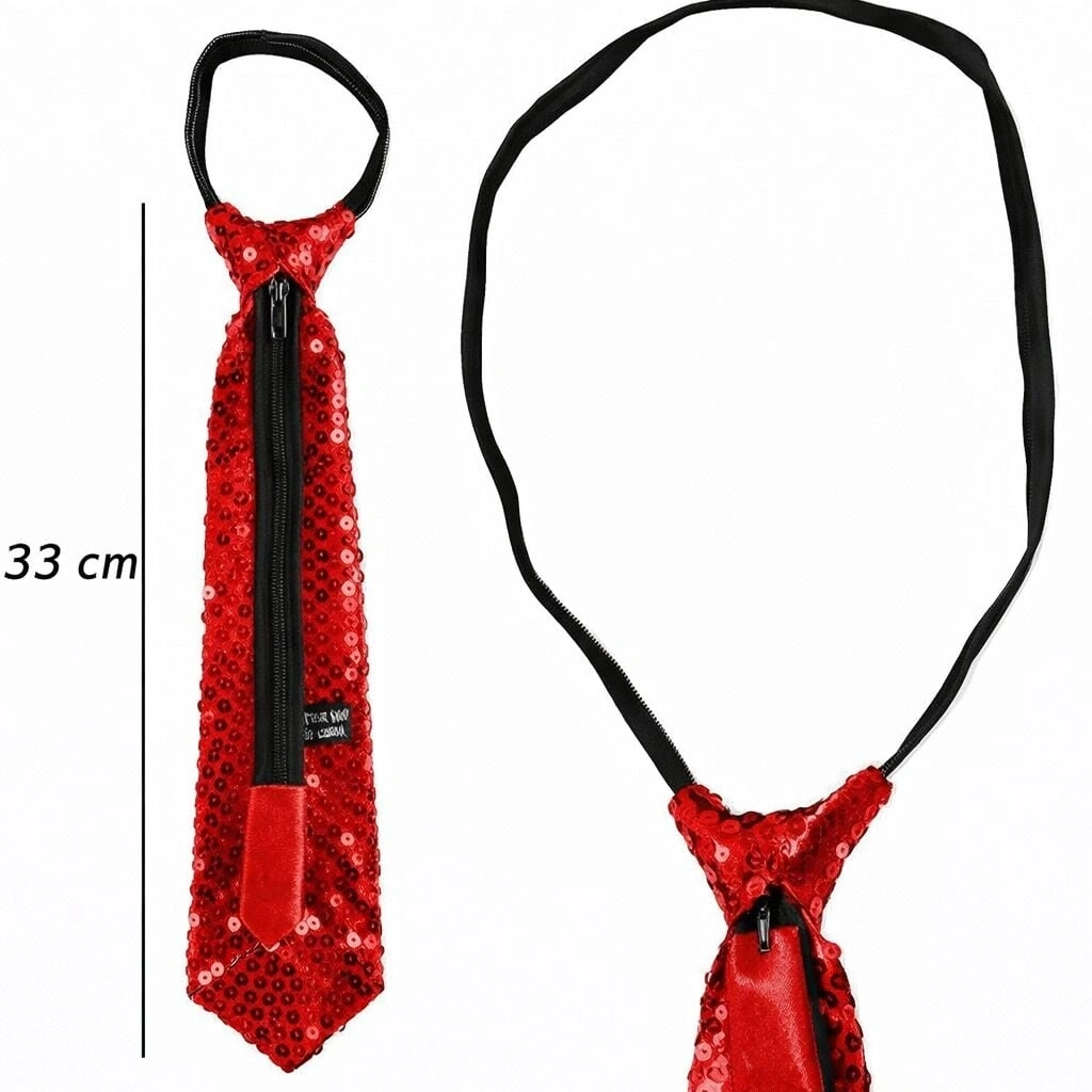 Parlak kırmızı rengi ve göz alıcı pul payet kaplaması ile bu parti kravatı, bulunduğunuz ortamda tüm dikkatleri üzerinize çeker. Işığı yansıtan yüzeyi sayesinde sahne, doğum günü, yılbaşı, konsept parti ve özel organizasyonlarda enerjik bir görünüm sunar.