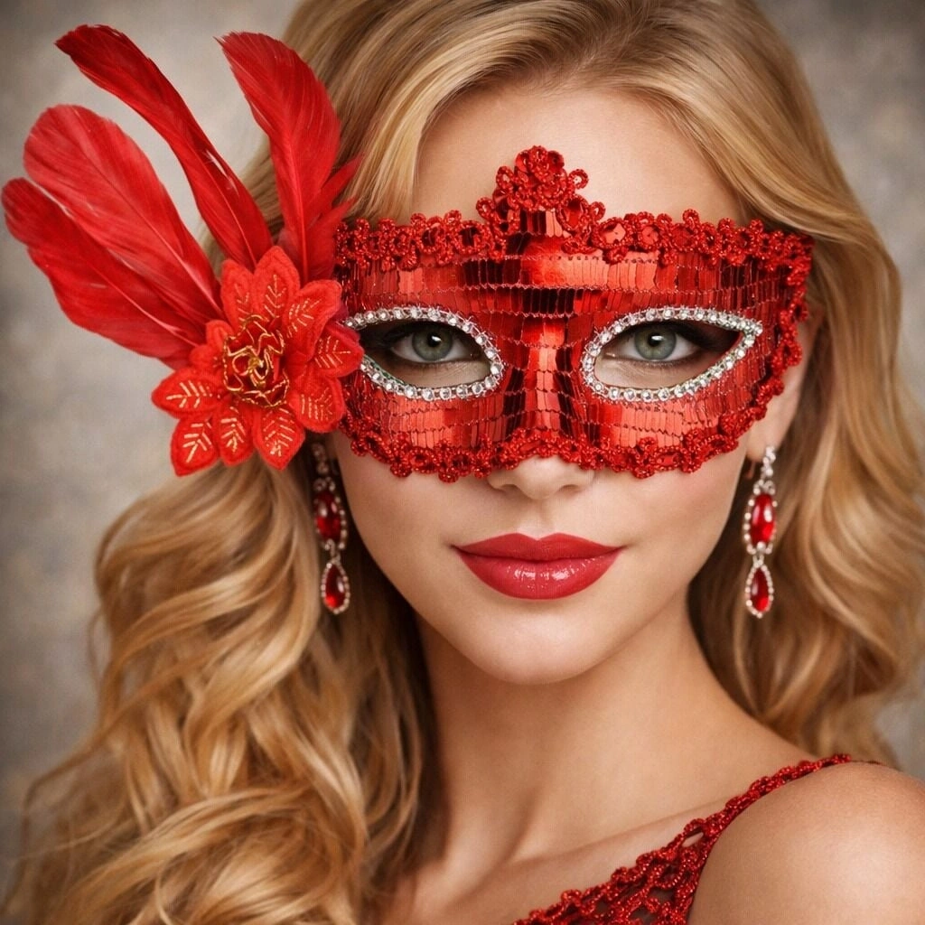 Partilerin yıldızı olmak ister misiniz? O halde kırmızı renk yandan tüylü payetli parti maskemiz tam size göre!